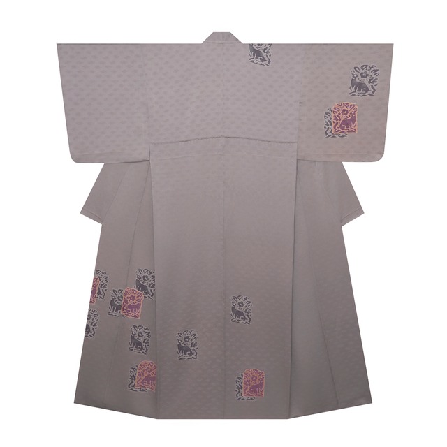 細かな地模様のある上質なちりめんの生地が淡いグレー・枯野色に染められ、中くらいの大きさの華文と十字の模様が鴇浅葱色で染められた、どこか格調高さのある小紋のお着物です。 一見、正倉院裂の文様のようにも見えたのですが、こちらは多ち花さんの創業者の方が、ヨーロッパに旅行された際に手に入れられた古い更紗の裂にインスパイアーされて起こされた柄のようで、「イタリア更紗」のタイトルが付けられています。 シンプルな繰り返しの模様のように見えますが、ひとつずつ摺り重ねて模様を染められ、それを色止めして摺り染めで地染めされているようで、とても手のかかったお着物のようです。 淡い色調がとても上品で、小紋のお着物でありながらも格の高さを感じられる、素敵なお着物となっています。 こちらのお着物ですと、綴れ織やすくい織などのポイント柄の帯を合わされたり、名物裂的な模様や有職文様などの帯を合わされたり、間道や吉野格子などの帯を合わされたりすると良いと思います。 お茶のお席や和のお稽古の会などにお召しになるのも良いでしょうし、お食事の会や観劇、美術鑑賞、音楽鑑賞などにお召しになるのも良いと思います。 爽やかで上品なお着物ならではの華やかさが魅力的で、とても落ち着きのある素敵な、大変おすすめの一点です。 【お品物につきまして】 リサイクル品で良い状態でしたが、とても特殊な寸法であったため、お仕立て替えをいたしました。 地の色は枯野色「和色大辞典 #d3cbc6」https://www.colordic.org/colorsample/d3cbc6 模様の色は鴇浅葱(ときあさぎ)「和色大辞典 #cc9893」https://www.colordic.org/colorsample/cc9893 をご参照下さい。 ◆サイズ 身丈:169 cm /4 尺 4 寸 7 分 裄丈:69 cm /1 尺 8 寸 3 分 袖丈:49.5 cm /1 尺 3 寸 1 分 前巾:24.2 cm /6 寸 4 分 後巾:30 cm /7 寸 9 分 衽巾:15 cm /4 寸 0 分 褄下:81.5 cm /2 尺 1 寸 6 分 袖巾:35 cm /9 寸 3 分 ◆詳細 状態:お仕立て替え済 付属品:なし ◆商品コード:2020000045519