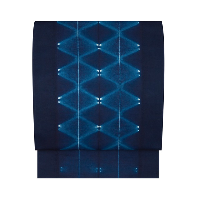 ★こちらは 「春の工芸名品展」https://kawanoya.buyshop.jp/p/00036 にて販売予定の商品です。 日本古来の絞り染めを独特のデザインとセンスによって、お着物に限らずインテリアに至るまで、現代の暮らしの中に映える美しさで、まるで新しいアイテムのように花開かせる福本潮子さんの藍染めの袋帯の作品です。 しなやかさと綺麗な光沢のあるトルファン綿が、表は板締め絞りで横長の菱形のような模様が暈し染めされ、その角には小さな白い丸が置かれ、サーチライトのような直線の光のシャープさのある図案が染められています。 裏面もやはり板締絞りで染められていて、縦の縞のような線に蛍の光のような小さな丸い形が並んだ、どちらもブルーアンドホワイトのコントラストが美しいデザインで表現されたお洒落な模様となっています。 絞り染めならではの偶発的に発生する白の線や丸の面白さが、上手くデザインとして取り入れられて、お洒落な模様を描いた素敵な帯となっています。 こちらは作家札などの付属品はありませんが、元の持ち主の方からの伝聞と、独特の光沢のあるトルファン綿を使用されていること、優れたデザインから福本潮子さんの作品と判断いたしました。 そのため、素晴らしい作品ではありますが大変お値打価格とさせていただいております。 こちらの帯ですと、趣味系の紬のお着物などに合わせてお召しになると良いと思います。 結城紬や大島紬、塩沢お召、紅花紬、花織紬、琉球絣などのいろいろな産地のお着物にもお洒落に合いますし、みじん格子や万筋などの無地感覚の紬のお着物にも合わせていただけます。 キリッとした藍染のモダンな帯ですので、ちょっと格好良く素敵な着こなしをお楽しみいただけるのではなないでしょうか。 藍染めの帯は、同じ藍系のお着物とも、グレー系やベージュ系の淡色のお着物とも綺麗に合いますので、広い範囲にお召しいただけると思います。 白い丸の絞りの模様が、ポッと灯りがともったように綺麗なアクセントとなって、お洒落さが格別に感じられるような、独特の個性がとても魅力的な大変おすすめの逸品です。 【お品物につきまして】 未着用のとても良い状態となっています。 地の色は濃藍「和色大辞典 #0f2350」https://www.colordic.org/colorsample/0f2350 絞りの色は藍色「和色大辞典 #165e83」https://www.colordic.org/colorsample/165e83 生成り色「和色大辞典 #fbfaf5」https://www.colordic.org/colorsample/fbfaf5 をご参照下さい。 ◆サイズ 長さ:446 cm / 1 丈 1 尺 8 寸 0 分 太鼓巾:31 cm / 8 寸 2 分 ◆詳細 状態:未着用品 付属品:なし ◆商品コード:2020000045366