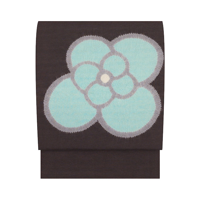 少しだけ赤味の感じられる黒に近い濃い焦げ茶・赤墨色の紬ちりめんの生地に、お太鼓には大きな水色のお花が絞り染めで染められ、源氏鼠色の縁取りをされて中心だけ白く染め抜かれた、ポップな楽しさのある素敵な九寸の開名古屋帯です。 黒に近い焦げ茶色の地に、綺麗な透明感のある秘色色の水色がとても映えていて、なんだか元気の良いイメージで、フレッシュさのある模様がとても魅力となっています。 絞り染めで染められていることによるギザギザした輪郭など、友禅染などとはまた違った面白さもあり、ポップアートのような模様がとてもお洒落です。 素材の紬ちりめんとは、紡いだ緯糸に撚りをかけて織られたもので、一般的なちりめんほどシボが大きくなく、伸縮性も強くはありませんが平織の紬の素材よりは多少弾力性があります。 発色も一般的なちりめんの生地に染められたものほど強くないため、柔らかい印象になります。 表の素材が柔らかいためか、絹の起毛芯が使用されていて、とても軽くお使いいただきやすいことと思います。 こちらの帯の材質ですと、柔らかい素材のお着物にも、趣味系のお洒落着の紬類のお着物にも合わせられますので、幅広くお召しいただけると思います。 地紋無地、江戸小紋、小紋などのお着物と合わせて、お茶のお席や和のお稽古の会などにお召しになるのも良いでしょうし、ちょっとしたお食事の会や観劇、音楽鑑賞などにも良いと思います。 結城紬や大島紬、塩沢お召、紅花紬、信州紬、米沢紬などの産地物のお着物、無地系の光沢のあるような作家物などのお着物、また、みじん格子や万筋などの無地感覚の紬のお着物と合わされるのも良いと思います。 パッとお花が咲いたような華やかさが着こなしのポイントとなってくれそうな、とても素敵な大変おすすめの一点です。 【お品物につきまして】 リサイクル品ですが、シミや汚れなどはなくとても良い状態となっています。 胴の裏面には裏地がついておらず、帯芯に直接かがりつけられた開名古屋帯のお仕立てとなっています。 地の色は赤墨「和色大辞典 #3f312b」https://www.colordic.org/colorsample/3f312b 花の色は秘色色(ひそくいろ)「和色大辞典 #abd9d9」https://www.colordic.org/colorsample/abd9d9 源氏鼠「和色大辞典 #888084」https://www.colordic.org/colorsample/888084 をご参照下さい。 ◆サイズ 長さ:368 cm / 9 尺 7 寸 4 分 太鼓巾:30.2 cm / 8 寸 0 分 ◆詳細 状態:リサイクル品 付属品:反端 ◆商品コード:2020000046226