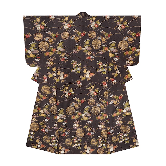 少しだけ大きめの紗綾型の地模様のある紋意匠のしっかりとした生地が、こっくりとした焦げ茶・紅消鼠色に染められ、全体に芝の模様が大きな弧を描くように金彩で描かれ、それに椿や万寿菊のようなお花、野菊のような素朴なお花、水仙などが絶妙な色合いの摺型友禅で一方附の配置に染められて、上前から下前、肩口、袖などに散らされた手の平くらいの大きさの雪輪の中には、霞や紙吹雪のような模様が摺り金の加工で描かれ、部分的には手刺繍まで加えられた、とてもゴージャスな雰囲気の訪問着のお着物です。 深い地色と金彩とのコントラストなどには江戸の小袖を彷彿させるようなところもあって、古色然とした重厚さがとても素敵です。 そのデザインや摺型友禅の凝った技法などからも、京都の多ち花さんの作ではないかと思われますが、参考資料などがないため判明しません。 いずれにしても、大変手の込んだ素晴らしいお着物ということが顕著にわかるような加工の良さが各所に見られ、全体的にもとても豪華で気品の感じられるものとなっています。 こちらのお着物ですと、錦織や唐織などのボリューム感のあるような帯を合わせて、ご結婚式の披露宴や式典、パーティーなどにお召しになるのも良いですし、有職文様や名物裂的な帯を合わせて、お茶のお席や和のお稽古の発表会などにお召しになるのも良いと思います。 また、少し改まったお食事の会や観劇、芸術鑑賞などにも良いのではないでしょうか。 八掛にも共の生地が使用されていて、金彩で芝の模様が染められています。 全体的に草花がグループで描かれていますが、それが全て繋がるように染められていることもとても豪華な雰囲気となっています。 近年では珍しいと思われる、とても凝った加工で本格的なお着物らしさのある、上質でお洒落な大変おすすめの一点です。 【お品物につきまして】 ❗❗❗リサイクル品で、全体的には大変良い状態となっていますが、胴裏の衽の剣先あたりに点のようなものが見られます。 ご着用には問題はないと思われますが、そのため少々お値打価格とさせていただいております。❗❗❗ 身丈を6cm、裄丈を3.5cm(袖巾を1cm)出す事が可能です。 袖丈は、標準の1尺3寸(49cm)につめても柄に影響はありません。 袖丈詰めは8,800円(税込)にて承ります。 お直し等につきましては、お気軽にご相談くださいませ。 地の色は紅消鼠「和色大辞典 #524748」https://www.colordic.org/colorsample/524748 花の色は紅樺色「和色大辞典 #bb5548」https://www.colordic.org/colorsample/bb5548 金色(こんじき)「和色大辞典 #e6c35c」https://www.colordic.org/colorsample/e6c35c 湊鼠「和色大辞典 #80989b」https://www.colordic.org/colorsample/80989b 胡粉色「和色大辞典 #fffffc」https://www.colordic.org/colorsample/fffffc 老竹色「和色大辞典 #8a996b」https://www.colordic.org/colorsample/8a996b 葉の色は赤白橡(あかしろつるばみ)「和色大辞典 #cca68f」https://www.colordic.org/colorsample/cca68f をご参照下さい。 ◆サイズ 身丈:163(+6) cm /4 尺 3 寸 1 分 裄丈:66(+3.5) cm /1 尺 7 寸 5 分 袖丈:56(-6) cm /1 尺 4 寸 8 分 前巾:24 cm /6 寸 3 分 後巾:30.2 cm /8 寸 0 分 衽巾:15 cm /4 寸 0 分 褄下:78.6 cm /2 尺 0 寸 8 分 袖巾:33(+1) cm /8 寸 7 分 ◆詳細 状態:リサイクル品 付属品:なし ◆商品コード:2020000043881