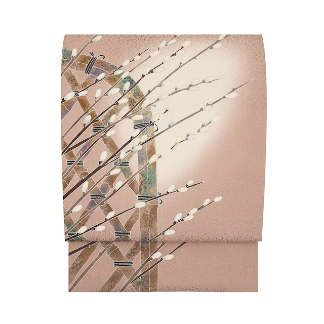 伝統工芸士 田邊慶昴 竹垣にネコヤナギの模様 東京友禅開名古屋帯【中古】