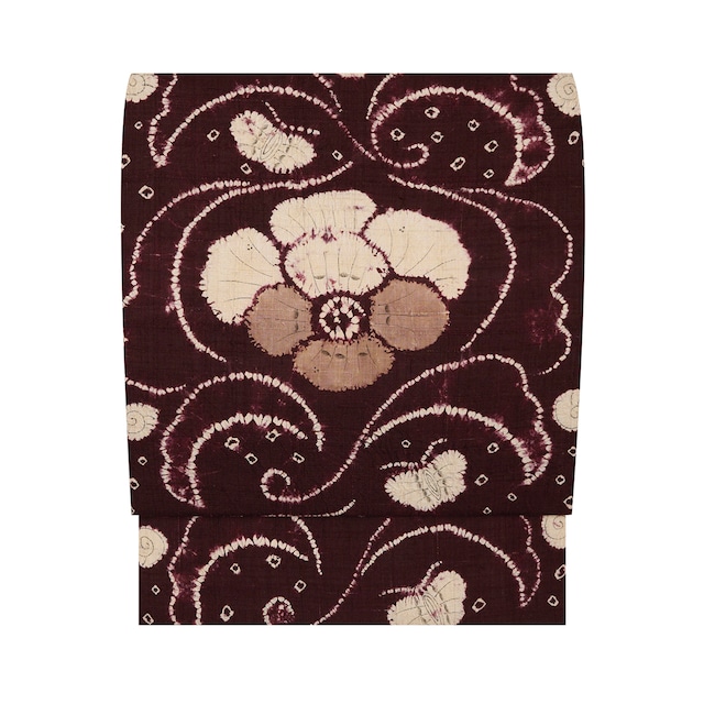横の節の表情が面白い座繰りの紬地が、こっくりとした赤味のある濃い茶・葡萄色に染められ、少しディフォルメされた大きな牡丹のお花と、蔓の形にされた葉、小さな蝶々に、丸いカタツムリのような模様が絞り染めで象牙色に染め抜かれ、ところどころに墨で模様が入れられ、お太鼓の牡丹のお花には胡桃染色が挿された、躍動感の感じられる大胆なデザインのとてもお洒落な全通の九寸の開名古屋帯です。 同じ図案が連続していますが、絞り染めで染められているために、偶発的な発色の違いやお花などの表情の違いが楽しく見られます。 地染めの葡萄色も、化学染料というよりは茜染めなどの草木染的な色合いとなっていて、濃い色の深い味わいと薄い色の透明感がとても綺麗に目に映ります。 デザインの大胆さやお洒落さからも、しかるべき作家作品ではないかと思われますが、何も手がかりがありませんので、とてもお値打価格とさせていただいております。 こちらの帯ですと、趣味系の紬類のお着物と合わせてお召しになると良いと思います。 結城紬や大島紬、塩沢お召、琉球絣や信州紬などのいろいろな産地のお着物と合わされたり、格子や縞模様の紬のお着物と合わされたり、ミックス系の無地っぽいお着物と合わされたりすると良いのではないでしょうか。 そういった装いで、趣味のお集まりやお友達とのお食事の会、コンサート、観劇、美術館、展示会などにお出かけになるのも良いですね。 蝶々のまわりの水の玉のような小さな豆絞りが可愛らしく、そこにカタツムリのようなぐるぐる渦巻が置かれて、なんとなくメルヘンティックな雰囲気もあります。 こっくりとした地の色がとても魅力的で、着こなしにもメリハリを与えてくれそうです。 手仕事でつくられた工芸的な良さが感じられる、とてもお洒落な、大変おすすめの一点です。 【お品物につきまして】 未着用のとても良い状態となっています。 手先から約46cmまで半分に折ってあり、胴の裏面に薄紫色の薄手の絹の生地がつけられた、松葉仕立ての開名古屋帯となっています。 地の色は葡萄色(えびいろ)「和色大辞典 #4d011d」https://www.colordic.org/colorsample/4d011d 模様の色は象牙色「和色大辞典 #f8f4e6」https://www.colordic.org/colorsample/f8f4e6 胡桃染「和色大辞典 #a68274」https://www.colordic.org/colorsample/a68274 をご参照下さい。 ◆サイズ 長さ:373 cm / 9 尺 8 寸 7 分 太鼓巾:30.8 cm / 8 寸 1 分 ◆詳細 状態:未着用品 付属品:たとう紙 ◆商品コード:2020000043836