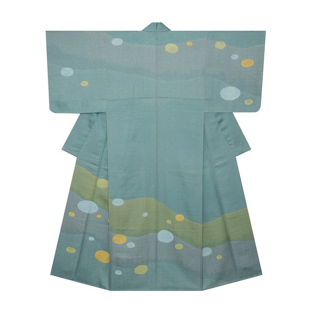 中くらいの大きさの海松の図案が地模様として織り込まれた上質な紋意匠の生地が、少しだけ緑味のある淡い藍・青碧色に染められ、肩口や裾周りは流れる水のようなうねりのある線で区切られ、その中に細い縦の線が何段も手描きで引かれ、それを背景に水の玉のように散らされた大小の丸が、一珍染のようなひび割れになった手描きのロウケツ染で描かれた、とてもお洒落な雰囲気の訪問着のお着物です。 細かく引かれた縦の線も手描きのロウケツ染で描かれていますが、見事に均整の取れていて驚いてしまいます。 こちらのような、海松の地模様の上質な生地に手描きのロウケツ染で染められるパターンのお着物は、千切屋さんが力を入れて発表されていたものでもありますので、おそらく千切屋さんのお着物ではないかと思われます。 シンプルに見える図柄も手描きで端正に染められていて、また大小の丸も一珍染の技法で染められて変化が感じられ、各所にこだわりの見られる素晴らしいお着物となっています。 こちらのお着物ですと、錦織や唐織などのボリューム感のあるような袋帯を合わせて、ご結婚式の披露宴や式典、パーティーなどにご出席されるのも良いと思います。 また、有職文様や名物裂的な帯合わせで、お茶のお席や和のお稽古の発表会などにお召しになったり、少し改まったお食事の会や観劇、芸術鑑賞などにお召しになったりしても良いと思います。 品質の良さからくる上品さとお洒落さが、素敵なフォーマルの装いを実現してくれることと思える、とてもお洒落な大変おすすめの一点です。 【お品物につきまして】 未着用のとても良い状態となっています。 八掛には共の生地が使用されています。 若草色の重ね衿がつけられています。 裄丈を3.5cm出す事が可能です。 お直し等につきましては、お気軽にご相談くださいませ。 地の色は青碧「和色大辞典 #6b9799」https://www.colordic.org/colorsample/6b9799 線の色は青朽葉「和色大辞典 #ccc27a」https://www.colordic.org/colorsample/ccc27a 薄柿「和色大辞典 #d4acad」https://www.colordic.org/colorsample/d4acad 枯野色「和色大辞典 #d3cbc6」https://www.colordic.org/colorsample/d3cbc6 丸の色は緑黄色「和色大辞典 #dbd26e」https://www.colordic.org/colorsample/dbd26e 山葵色「和色大辞典 #a8bf93」https://www.colordic.org/colorsample/a8bf93 秘色色(ひそくいろ)「和色大辞典 #abced8」https://www.colordic.org/colorsample/abced8 をご参照下さい。 ◆サイズ 身丈:164.5 cm /4 尺 3 寸 5 分 裄丈:66.5(+3.5) cm /1 尺 7 寸 6 分 袖丈:49.3 cm /1 尺 3 寸 0 分 前巾:24.8 cm /6 寸 6 分 後巾:29.5 cm /7 寸 8 分 衽巾:15.3 cm /4 寸 0 分 褄下:79.5 cm /2 尺 1 寸 0 分 袖巾:34.4 cm /9 寸 1 分 ◆詳細 状態:未着用品 付属品:なし ◆商品コード:2020000043737