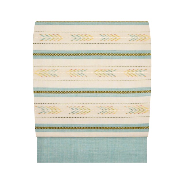 ★こちらは 「春の工芸名品展」https://kawanoya.buyshop.jp/p/00036 にて販売予定の商品です。 生絹の糸で織られていることで全体に透明感がある、シャリっとした質感の象牙色の地に、等間隔に秘色色の水色が綺麗に配置されて横に織り出され、それに重なるように木蘭色の小さな市松の縞が織り込まれて、その段の間には右行きと左行きの矢印のような絣が交互に織り込まれた、とても清々しく素敵な九寸名古屋帯です。 オリジナリティあふれるデザインと、繊細で洗練された織物の面白さを改めて感じられるようなセンスの光る作品をつくり続けていらっしゃる、国画会会員の小島秀子さんの素敵な作品です。 タイトルにあるように、矢印のような絣の模様は木の葉を表しているのだと思われます。 青碧色の藍緑色から萌葱色、そしてレモンイエローの女郎花色へとグラデーションになっていて、その両端は赤紅色が配置されて可愛らしいアクセントとなっていますが、その細やかなこだわりにも驚きを感じられます。 袷の時期から、初夏にかけての単衣の頃までお使いいただける、爽やかさな印象の素敵な帯です。 こちらの帯ですと、柔らかい素材のお着物とも、趣味系の紬類のお着物とも、広い範囲に合わせていただけると思います。 地紋無地や江戸小紋、小紋などのお着物に合わされたり、地模様のあるお召織の無地系のお着物などと合わされたりして、お茶のお席や和のお稽古の会などにも良いですし、お食事会や観劇、美術鑑賞、音楽鑑賞などにお召しになるのも良いでしょう。 また、結城紬や大島紬、塩沢お召、紅花紬、琉球絣、信州紬などのお着物や、みじん格子や万筋などの無地感覚の紬のお着物と合わされるのも良いと思います。 光沢のあるような作家物などの無地系のお着物に合わされるのもお洒落ですね。 計算された優れたデザインを、さらりと実現されているようなその凄さにも感動を覚える、とても素晴らしい大変おすすめの逸品です。 【お品物につきまして】 リサイクル品ですが、シミや汚れなどはないとても良い状態となっています。 胴の部分には裏地がついておらず、帯芯に直接縫い代をかがりつけられた額縁仕立てとなっています。 地の色は象牙色「和色大辞典 #f8f4e6」https://www.colordic.org/colorsample/f8f4e6 段の色は秘色色(ひそくいろ)「和色大辞典 #abd9d9」https://www.colordic.org/colorsample/abd9d9 木蘭色(もくらんじき)「和色大辞典 #c7b370」https://www.colordic.org/colorsample/c7b370 絣の色は女郎花「和色大辞典 #f2f291」https://www.colordic.org/colorsample/f2f291 萌黄「和色大辞典 #aacf53」https://www.colordic.org/colorsample/aacf53 青碧「和色大辞典 #478384」https://www.colordic.org/colorsample/478384 赤紅「和色大辞典 #c53d43」https://www.colordic.org/colorsample/c53d43 をご参照下さい。 ◆サイズ 長さ:380 cm / 1 丈 0 尺 0 寸 5 分 太鼓巾:31 cm / 8 寸 2 分 ◆詳細 状態:リサイクル品 付属品:タグ ◆商品コード:2020000039372