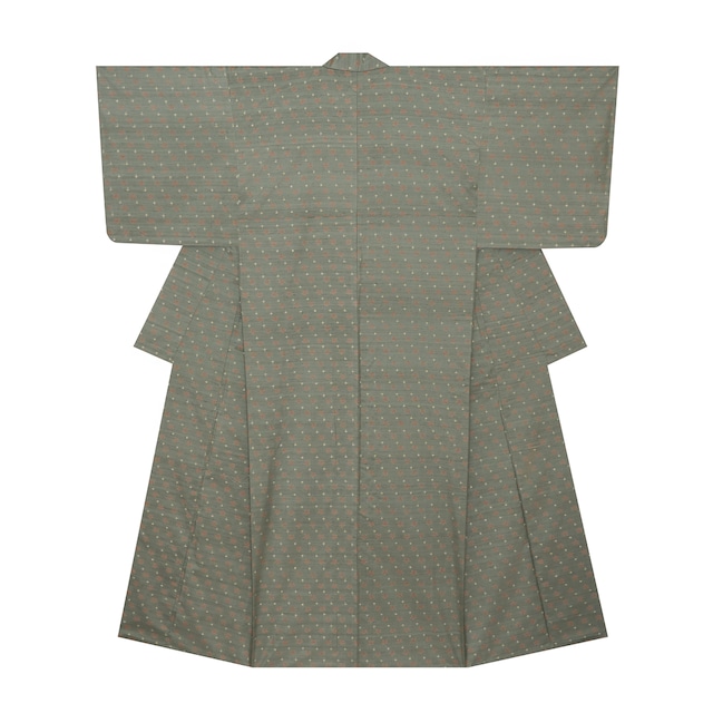 緯糸に変化のある節がたくさん見られる座繰りの糸の味わいがとても魅力的なグレー味のある薄緑・青鈍色の地に、段変わりに洗朱色の小さなお花と、象牙色の十字絣が織り込まれた、とてもお洒落な雰囲気の十日町産と思われる紬のお着物です。 長い歴史があり、品質にも安定感のある十日町の織物ですが、やはり時代に合わせてどんどん進化して、品質的にも良いものがたくさん作られています。 こちらのお花の絣も十字絣も、手括りならではの絣足の表情が楽しく感じられ、草木染ではないかと思われる発色となっていて、柔らかい色調がとても優しく目に映ります。 オリジナリティのあるデザインで、絣の味わいを最大限に活かしたような手織りの風合いが感じられる、素敵なお着物となっています。 こちらのお着物ですと、季節のものをモチーフにしたような手描きや友禅染などの帯、すくい織や綴れ織などのポイント柄の帯、また間道や吉野格子、めがね織などの帯を合わされると良いのではないでしょうか。 そういった装いで、趣味のお集まりやお友達とのランチの会、観劇、コンサート、講演会や展示会、美術館、お買い物などにお出かけされるのも良いのですね。 着心地の良さにも定評のある十日町紬ですので、きっとお召しいただきやすいことと思います。 小さなお花の絣がとてもチャーミングで、白い十字絣が綺麗なアクセントとなったお洒落な大変おすすめの一点です。 【お品物につきまして】 リサイクル品ですが、シミや汚れなどはなくとても良い状態となっています。 袖丈を3cm出す事が可能です。 お直し等につきましては、お気軽にご相談くださいませ。 表の色は青鈍(あおにび)「和色大辞典 #859989」https://www.colordic.org/colorsample/859989 絣の色は洗朱「和色大辞典 #b37b6b」https://www.colordic.org/colorsample/b37b6b 象牙色「和色大辞典 #f8f4e6」https://www.colordic.org/colorsample/f8f4e6 をご参照下さい。 ◆サイズ 身丈:167 cm /4 尺 4 寸 2 分 裄丈:68.4 cm /1 尺 8 寸 1 分 袖丈:47.4(+3) cm /1 尺 2 寸 5 分 前巾:24.7 cm /6 寸 5 分 後巾:30.2 cm /8 寸 0 分 衽巾:15.2 cm /4 寸 0 分 褄下:79.5 cm /2 尺 1 寸 0 分 袖巾:33.5 cm /8 寸 9 分 ◆詳細 状態:リサイクル品 付属品:なし ◆商品コード:2020000043904