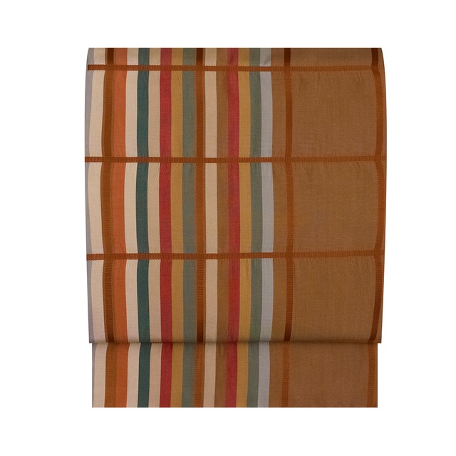しなやかでしっとりとした遠州茶色の地に、左寄りに高麗納戸色の濃いグレー、臙脂色、白茶色のベージュ、鈍色のグレー、そして伽羅色など10色の縞が織り込まれ、それをまたぐように茶色の真田織の吉野格子が交差するように織り込まれた、弥左衛門間道の両面全通の丸帯です。 「弥左衛門間道」は名物裂のひとつで、大名物日野肩衝(かたつき)茶入や中興名物玉津(ちゅうこうめいぶつ)茶入の仕覆などとして用いられています。 鎌倉時代に宋に渡った博多の満田弥左衛門が、宗より持ち帰って伝えられたと言われています。 赤味のある茶と紺の配色のものが広く知られていますが、こちらは少しカラフルな色使いで、オリジナルとは少し違った趣となっています。 間道手の帯は格調高さもありながら、どこか格好の良い粋さとカジュアルさも持ち合わせていますので、いろいろなお着物と合わせて個性的な着こなしをお楽しみいただけるのではないかと思います。 こちらの帯ですと、地紋無地や江戸小紋、飛び小紋のお着物、また地模様のあるお召織の無地系のお着物などに合わせて、お茶のお席や和のお稽古の会などにお召しになるのも良いですし、ちょっとしたご挨拶やお食事の会、観劇、美術鑑賞や音楽鑑賞などにも良いと思います。 また、大島紬や結城紬、塩沢お召、紅花紬などの産地物のお着物、あるいは万筋やみじん格子などの無地感覚の紬系のお着物と合わされるのもお洒落で良いのではないでしょうか。 無地の結城紬や少し光沢のあるような無地の紬類などと合わされるのも素敵ですね。 そういった装いで、趣味のお集まりや同窓会、お友達とのランチの会、コンサート、作家さんの個展やお買い物などにお出かけされるのも良いのではないでしょうか。 間道手ならではのお洒落さと格調高さが魅力となった、しなやかできっとお使いいただきやすいと思える、品質の良い大変おすすめの一点です。 【お品物につきまして】 リサイクル品ですが、シミや汚れなどはなくとても良い状態となっています。 地の色は遠州茶「和色大辞典 #996250」https://www.colordic.org/colorsample/996250 間道の色は高麗納戸「和色大辞典 #2c4f54」https://www.colordic.org/colorsample/2c4f54 臙脂「和色大辞典 #b94047」https://www.colordic.org/colorsample/b94047 白茶「和色大辞典 #ddbb99」https://www.colordic.org/colorsample/ddbb99 鈍色(にびいろ)「和色大辞典 #727171」https://www.colordic.org/colorsample/727171 伽羅色(きゃらいろ)「和色大辞典 #d8a373」https://www.colordic.org/colorsample/d8a373 薄色「和色大辞典 #a89dac」https://www.colordic.org/colorsample/a89dac 吉野格子の色は茶色「和色大辞典 #965042」https://www.colordic.org/colorsample/965042 をご参照下さい。 ◆サイズ 長さ:440 cm / 1 丈 1 尺 6 寸 4 分 太鼓巾:31.2 cm / 8 寸 3 分 ◆詳細 状態:リサイクル品 付属品:なし ◆商品コード:2020000044697