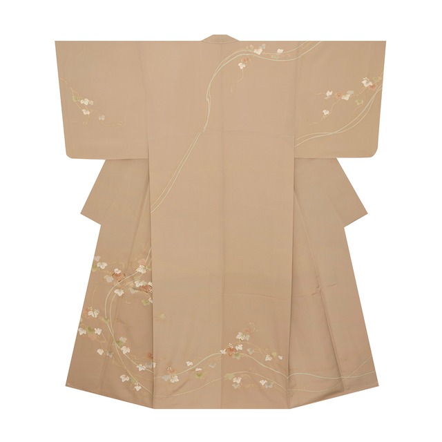 しっとりとした一越ちりめんの生地が甘さのあるグレーベージュ・枯野色に染められ、右の肩口から上前にぐるりと繋がって、そのまま下前に伸びる蔓と、その蔓に手描きの友禅で蔦の葉が色とりどりに描かれて手刺繍も施された、とても気品の感じられる素敵な訪問着のお着物です。 蔦の葉は明るい茶・赤白橡色や灰青色、老竹色の淡い緑などで彩色されたり、胡粉で色付けされたりして、金の細い線で縁取りもされ、部分的には金駒糸で刺繍もされて変化が感じられます。 蔦の葉は古くから世界中で好まれてきた模様で、古代ギリシャやローマ時代のものにも多く見られます。 豊穣の象徴として神殿の装飾や陶器などの日常の道具類などにも描かれていました。 日本では平安時代から、装束や調度品などにも用いられ、繁栄や長寿の意味合いを持ち好まれてきました。 こちらは少し紅葉したように色付いたものや、緑色の綺麗な葉や胡粉で色付けされたものもあり、広い季節にお召しいただけるようなお着物となっています。 たおやかに大きく伸びた蔓が優雅な雰囲気を醸し出す、素敵なお着物となっています。 こちらのお着物ですと、ボリューム感のある錦織や唐織などの袋帯などを合わせて、ご結婚式の披露宴や式典、パーティーなどにお召しになるのも良いと思います。 また、有職文様や名物裂的な文様の袋帯などを合わされたり、間道手や吉野間道などの帯を合わされたりして、お茶のお席や和のお稽古の発表会、お食事の会や観劇、芸術鑑賞などにお召しになるのも良いと思います。 あまりこってりとした雰囲気はありませんが、とても上品な色使いと品質の良さから高級感のあふれるような、とても素敵な大変おすすめの一点です。 【お品物につきまして】 未着用のとても良い状態となっています。 八掛けは共の生地が使用されていて、表と同じ模様が染められています。 地の色は枯野色「和色大辞典 #ccb1a3」https://www.colordic.org/colorsample/ccb1a3 蔦の色は赤白橡(あかしろつるばみ)「和色大辞典 #d6a181」https://www.colordic.org/colorsample/d6a181 灰青「和色大辞典 #c0c6c9」https://www.colordic.org/colorsample/c0c6c9 老竹色「和色大辞典 #7d996a」https://www.colordic.org/colorsample/7d996a 白茶「和色大辞典 #ddbb99」https://www.colordic.org/colorsample/ddbb99 胡粉色「和色大辞典 #fffffc」https://www.colordic.org/colorsample/fffffc をご参照下さい。 ◆サイズ 身丈:167 cm /4 尺 4 寸 2 分 裄丈:69 cm /1 尺 8 寸 3 分 袖丈:49.2 cm /1 尺 3 寸 0 分 前巾:26.5 cm /7 寸 0 分 後巾:31 cm /8 寸 2 分 衽巾:15 cm /4 寸 0 分 褄下:78 cm /2 尺 0 寸 6 分 袖巾:35 cm /9 寸 3 分 ◆詳細 状態:未着用品 付属品:なし ◆商品コード:2020000042624