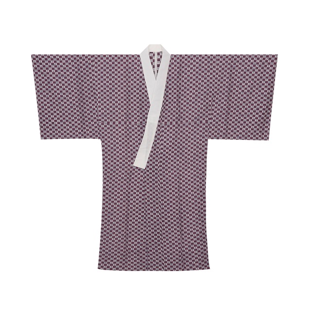 大きめの市松の地模様が織られた、少しシボのあるやや薄手の一越ちりめんの淡いピンク・灰梅色の生地に、帽子やバッグ、ハイヒール、日傘、ブーツ、イヤリング、口紅などいろいろなファッショングッズが飛び飛びに横に並んで淡いパステルトーンで描かれた、とてもお洒落な長襦袢です。 バッグは3種類くらいいろいろな形のものがあったり、帽子も大きめのつばのものと、お洒落な飾りのついたものがあったりと、見ているだけでも楽しくなります。 こちらの襦袢の色合いですと、地紋無地や江戸小紋、小紋などの柔らかい素材のお着物にも、趣味系の紬類のお着物にも合わせていただけると思います。 絹の塩瀬の半衿がつけられています。 袖は無双、身頃は単衣で、共の布の居敷当がつけられたお仕立てとなっています。 しつけは外されていますが、とても良い状態となっています。 ほんわかとした色使いと楽しいモチーフで、心が和むようなとても素敵な大変おすすめの一点です。 地の色は灰梅「和色大辞典 #e8d3c7」https://www.colordic.org/colorsample/e8d3c7 模様の色は長春色「和色大辞典 #c97586」https://www.colordic.org/colorsample/c97586 紺鼠「和色大辞典 #44617b」https://www.colordic.org/colorsample/44617b 柴染(ふしぞめ)「和色大辞典 #b28c6e」https://www.colordic.org/colorsample/b28c6e をご参照下さい。 ◆サイズ 身丈(背から):127 cm /3 尺 3 寸 6 分 裄丈:70 cm /1 尺 8 寸 5 分 袖丈:48.2 cm /1 尺 2 寸 8 分 前巾:28.4 cm /7 寸 5 分 後巾:32.5 cm /8 寸 6 分 衿巾:7.6 cm /2 寸 0 分 褄下:68.5 cm /1 尺 8 寸 1 分 袖巾:35.6 cm /9 寸 4 分 ◆詳細 詳細:リサイクル品 付属品:なし ◆商品コード:2020000041801