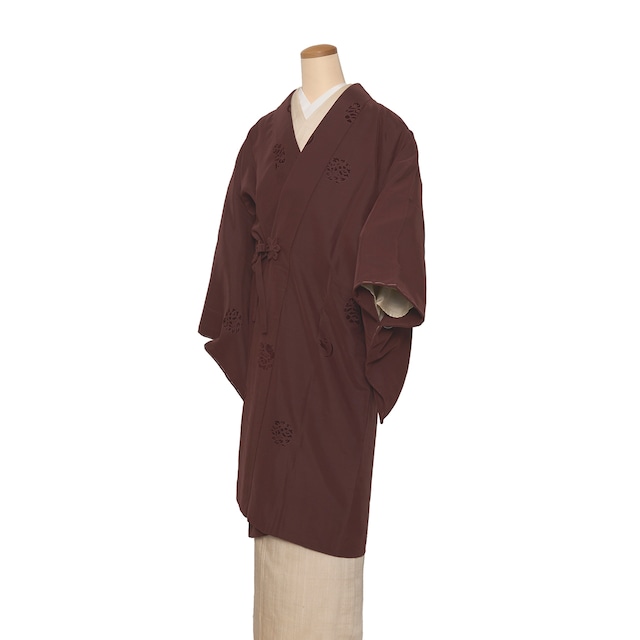 石畳のような、ひび割れのような地模様が織り出された、赤墨色のしっかりとした紋意匠の生地に、背中や肩、袖などに源氏香の模様が手刺繍されて絵羽附けとなった、とてもお洒落な高級感のある長羽織です。 源氏香は後水尾天皇の時代に考案されたといわれる組み香で、5種類の香りを組み合わせて52のパターンを作り出し、それぞれを源氏物語の各巻に当てはめるという遊びでした。 香道にあまり馴染みのない方でも、源氏香の模様は目にされることは多いと思いますが、古くから文学的な要素もあり、いろいろな工芸品や染織品の模様として取り入れられ、愛されてきました。 お着物や帯の模様などを見て、それをきっかけに改めて日本の文化を認識することもまた楽しいことです。 こっくりとした深さのある無地に散らされたいろいろな形の源氏香が、綺麗な色の手刺繍で表されて、とてもモダンさが感じられます。 こちらの羽織ですと、柔らかい素材のお着物にも、趣味系の紬類のお着物にも、広い範囲にお召しいただけると思います。 生地がしっかりとしていて、落ち感も綺麗です。 すっきりとした柄が、スマートな着姿を演出してくれるような、お洒落さのある大変おすすめの一点です。 【お品物につきまして】 未着用のとても良い状態となっています。 羽織紐がついていなかったため、当店で手組の品質の良い羽織紐をおつけしております。 地の色は赤墨「和色大辞典 #3f312b」https://www.colordic.org/colorsample/3f312b 刺繍の色は黄唐茶「和色大辞典 #b98c46」https://www.colordic.org/colorsample/b98c46 江戸茶「和色大辞典 #b37950」https://www.colordic.org/colorsample/b37950 をご参照下さい。 ◆サイズ 身丈(※肩から採寸):身丈:100 cm /2 尺 6 寸 5 分 裄丈:68.5 cm /1 尺 8 寸 1 分 袖丈:48.5 cm /1 尺 2 寸 8 分 前巾:22 cm /5 寸 8 分 後巾:32 cm /8 寸 5 分 マチ巾:5.7 cm /1 寸 5 分 袖巾:34.8 cm /9 寸 2 分 ◆詳細 詳細:リサイクル品 付属品:なし ◆商品コード:2020000043249 ※コーディネート掲載品は参考商品です。羽織のみの販売となります。