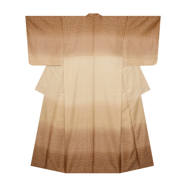 小ぶりの花唐草の地模様が黄金繭の糸でびっしりと織り出された薄卵色の生地の胸とひざの辺りに、白茶色の淡く明るいベージュ・白茶色の段が取られ、その上と一番裾はそれよりさらに濃く明るい茶・赭色に変わっていくといった、段暈し染めの絵羽となった訪問着附けの素敵なお着物です。 黄金繭はお蚕さんの繭が黄金色をしていて独特の柔らかい色合いと光沢があり、それから採った糸をこちらのように地模様として織り込みますと、そこだけが地織とは違った色合いとなり、高貴な雰囲気の模様が美しく現れます。 大変希少性の高いものでもありますが、独特のゴージャスさは他の織物では表現できないような魅力的なものとなり、気品のある輝きは古くからお着物ファンを魅了しています。 身頃の薄卵色の部分もとても綺麗ですが、段暈しに染められた部分は地模様がよりくっきりと立体的に感じられ、素晴らしい佇まいのお着物となっています。 こちらのお着物ですと、唐織や錦織などのボリューム感のある袋帯などを合わせて、ご結婚式の披露宴や式典、パーティーなどにご出席されるのも良いと思います。 また、有職文様や名物裂的な文様の帯、経錦の帯などを合わせて、お茶のお席や和のお稽古の発表会などにお召しになるのも良いですし、少し改まったお食事の会や観劇、芸術鑑賞などにも良いと思います。 友禅染などのお着物とはまた違った迫力があり、上質な生地の光沢が素晴らしい着姿を実現してくれることと思います。 絵羽附けの暈しの模様にも凛とした美しさがあり、スマートで洗練された素敵な着こなしをお楽しみいただけそうな、とても素晴らしい大変おすすめの一点です。 【お品物につきまして】 未着用のとても良い状態となっています。 段暈しの模様を絵羽で合わせるために、地衿のご着用では出ないところにタックをとって柄合わせをされています。 裄丈を2cm(袖巾を0.5cm)出す事が可能です。 お直し等につきましては、お気軽にご相談くださいませ。 地の色は薄卵色「和色大辞典 #fde8d0」https://www.colordic.org/colorsample/fde8d0 段の色は白茶「和色大辞典 #ddbb99」https://www.colordic.org/colorsample/ddbb99 赭(そほ)「和色大辞典 #995e4b」https://www.colordic.org/colorsample/995e4b をご参照下さい。 ◆サイズ 身丈:168 cm /4 尺 4 寸 4 分 裄丈:67.6(+2) cm /1 尺 7 寸 9 分 袖丈:49.7 cm /1 尺 3 寸 1 分 前巾:23.6 cm /6 寸 2 分 後巾:29.8 cm /7 寸 9 分 衽巾:15 cm /4 寸 0 分 褄下:78.8 cm /2 尺 0 寸 8 分 袖巾:33.7(+0.5) cm /8 寸 9 分 ◆詳細 状態:未着用品 付属品:なし ◆商品コード:2020000043126