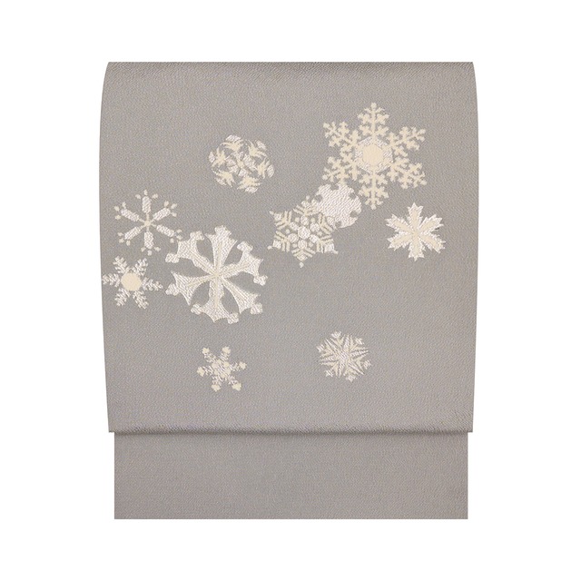 こっくりとした深みのあるグレー・紅消鼠色のしっかりとした塩瀬の生地に、お太鼓には白より少しグレー味のある素色の細い縦縞がびっしりと並んだ横段が4段取られ、それに絡むように枝垂れる蔦の葉が金彩の手描きで描かれ、そこに小さな野菊や柳、鳥などが細やかな手刺繍で表された、静かな品格のある素敵な九寸名古屋帯です。 蔦の葉は古くから世界中で好まれてきた模様で、古代ギリシャやローマ時代のものにも多く見られます。 豊穣の象徴として神殿の装飾や陶器などの日常の道具類などにも描かれてきました。 日本では平安時代から、装束や調度品などにも用いられ、繁栄や長寿の意味合いを持ち好まれています。 こちらは少し燻したようなあまり光らない金彩で手描きされていますが、主役としての存在を発揮していて、山里の風景を表したような風情の感じられるお洒落な雰囲気となっています。 それに寄り添うようにあしらわれた手刺繍もさりげない華やかさを添えていて、とても気品の感じられる帯となっています。 こちらの帯ですと、柔らかい素材のお着物にも、趣味系の紬類のお着物にも、広範囲に合わせていただけると思います。 地紋無地や江戸小紋、小紋などのお着物と合わされたり、地模様のあるお召織の無地系のお着物などと合わせて、お茶のお席や和のお稽古の会などにお召しになるのも良いですし、お食事の会や観劇、美術鑑賞や音楽鑑賞などにお召しになっても良いと思います。 また、結城紬や大島紬、塩沢お召、紅花紬、信州紬、花織紬などのお着物、みじん格子や万筋などの無地感覚の紬のお着物と合わされるのも良いでしょう。 そういった装いで、趣味のお集まりやお友達とのランチの会、コンサート、講演会、美術館や展示会、お買い物などにお出かけされるのも良いのではないでしょうか。 あまり季節も問わず、年齢的にも幅広く、きっと長くご愛用いただけて上質なお洒落さをお楽しみいただけることと思える、大変おすすめの一点です。 【お品物につきまして】 未着用のとても良い状態となっています。 地の色は紅消鼠「和色大辞典 #524748」https://www.colordic.org/colorsample/524748 段の色は素色(そしょく)「和色大辞典 #eae5e3」https://www.colordic.org/colorsample/eae5e3 刺繍の色は水柿「和色大辞典 #e4ab9b」https://www.colordic.org/colorsample/e4ab9b 錆色「和色大辞典 #6c3524」https://www.colordic.org/colorsample/6c3524 生成り色「和色大辞典 #fbfaf5」https://www.colordic.org/colorsample/fbfaf5 灰汁色(あくいろ)「和色大辞典 #9e9478」https://www.colordic.org/colorsample/9e9478 をご参照下さい。 ◆サイズ 長さ:377 cm / 9 尺 9 寸 7 分 太鼓巾:31.2 cm / 8 寸 3 分 前巾:15.5 cm / 4 寸 1 分 ◆詳細 状態:未着用品 付属品:なし ◆商品コード:2020000043867