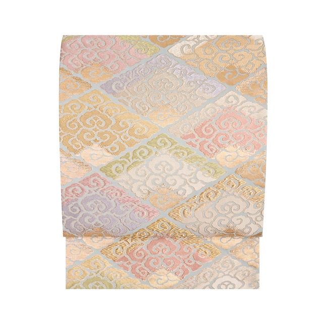 象牙色の細い糸をたくさん使って織られたシャリっとした質感の地に、裏葉柳色の薄緑と青白橡色のグレーの段が取られ、それに大きめの丸が重なって七宝繋ぎの文様が織り出され、その丸が重なるところには尾長鳥が対になって織り込まれ、また七宝の中には色とりどりの糸と金糸を使って華やかでいろいろなデザインのお花の模様が織り込まれた、気品の感じられる素敵な袋帯です。 西陣の織元である丸勇さんのお得意とされる、フォーマル用の素晴らしい作品です。 七宝繋ぎの中のお花は、ナデシコや桜、紫陽花などをディフォルメされたものや、華文の形にアレンジされたものがあり、色も宍色、浅紫色、松葉色、薄鼠色など豊富で、綺麗なパステルトーンでありながらも品の良いゴージャスさが感じられるものとなっています。 こちらの帯ですと、訪問着や附下、地紋無地、江戸小紋などのお着物と合わせて、ご結婚式の披露宴や式典、パーティーなどにご出席されるのも良いと思います。 また、お茶のお席や和のお稽古の発表会などにお召しになるのも良いでしょうし、少し改まったお食事の会や観劇、美術鑑賞、音楽鑑賞などにお出かけされるのも良いと思います。 とても軽くしなやかな質感となっていて、3シーズン的に比較的長い時期にお召しいただけると思います。 綺麗な色合いにも上品な華やかさが感じられて、とてもフレッシュな美しさがフォーマルな席でも華やぐことと思われる、大変おすすめの一点です。 【お品物につきまして】 未仕立てのものですので、非常に良い状態となっています。 お仕立てにはおよそ2週間頂戴いたします。 地の色は象牙色「和色大辞典 #f8f4e6」https://www.colordic.org/colorsample/f8f4e6 段の色は裏葉柳「和色大辞典 #b7cca3」https://www.colordic.org/colorsample/b7cca3 青白橡(あおしろつるばみ)「和色大辞典 #a0a897」https://www.colordic.org/colorsample/a0a897 花の色は宍色(ししいろ)「和色大辞典 #efab93」https://www.colordic.org/colorsample/efab93 浅紫「和色大辞典 #b37dab」https://www.colordic.org/colorsample/b37dab 松葉色「和色大辞典 #839b5c」https://www.colordic.org/colorsample/839b5c 薄鼠「和色大辞典 #9790a4」https://www.colordic.org/colorsample/9790a4 浅縹(あさはなだ)「和色大辞典 #74a3b3」https://www.colordic.org/colorsample/74a3b3 をご参照下さい。 ◆サイズ 長さ:440 cm / 1 丈 1 尺 6 寸 4 分 太鼓巾:31 cm / 8 寸 2 分 ◆詳細 状態:未仕立て(お仕立て無料) 付属品:西陣タグ ◆商品コード:2020000043706