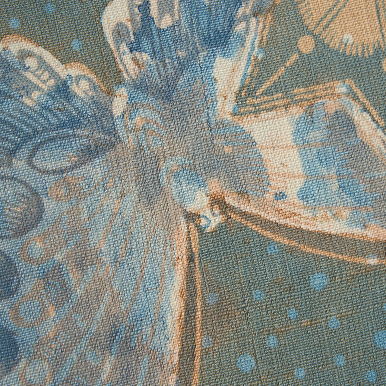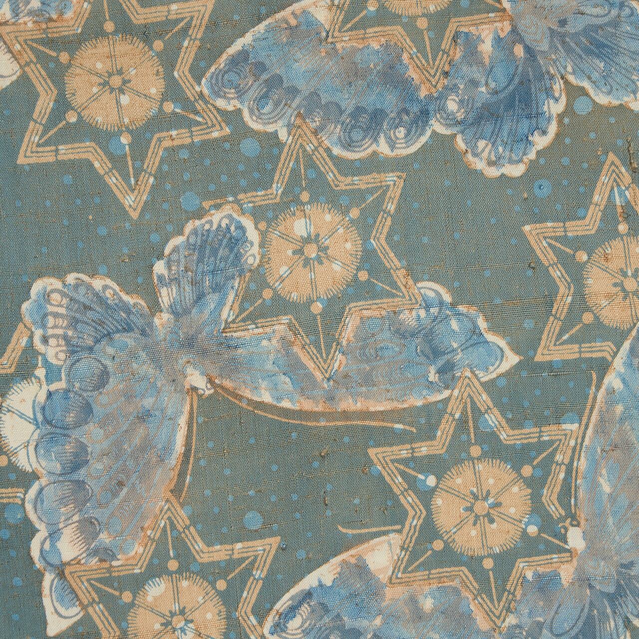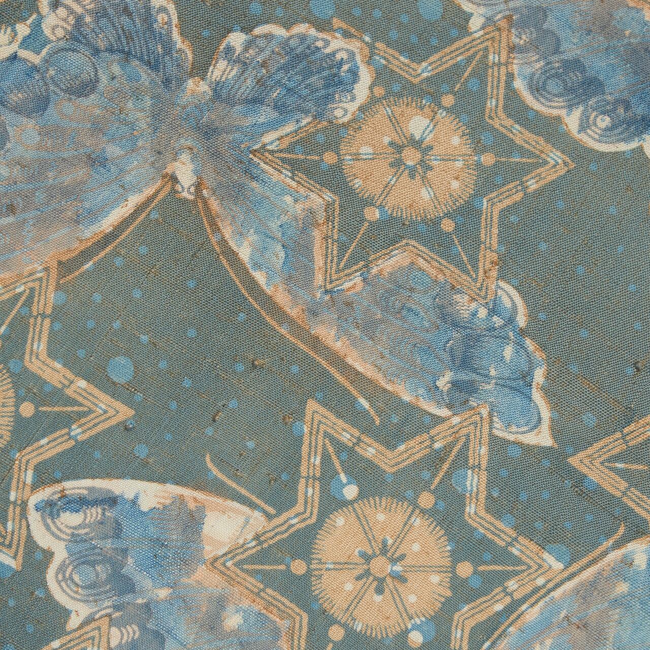 緯糸に味わいのある節が見られる、座繰りのシャリっとした質感の紬地が淡い藍・錆御納戸色に染められ、大きめの蝶々が飛び交い、それに重なるような星の模様が、中形の長板染で本藍染で染められたものに、丹殻の薄茶色が重なって染められ、全体的には水玉の模様が散らされた、躍動感のある素晴らしい作品です。