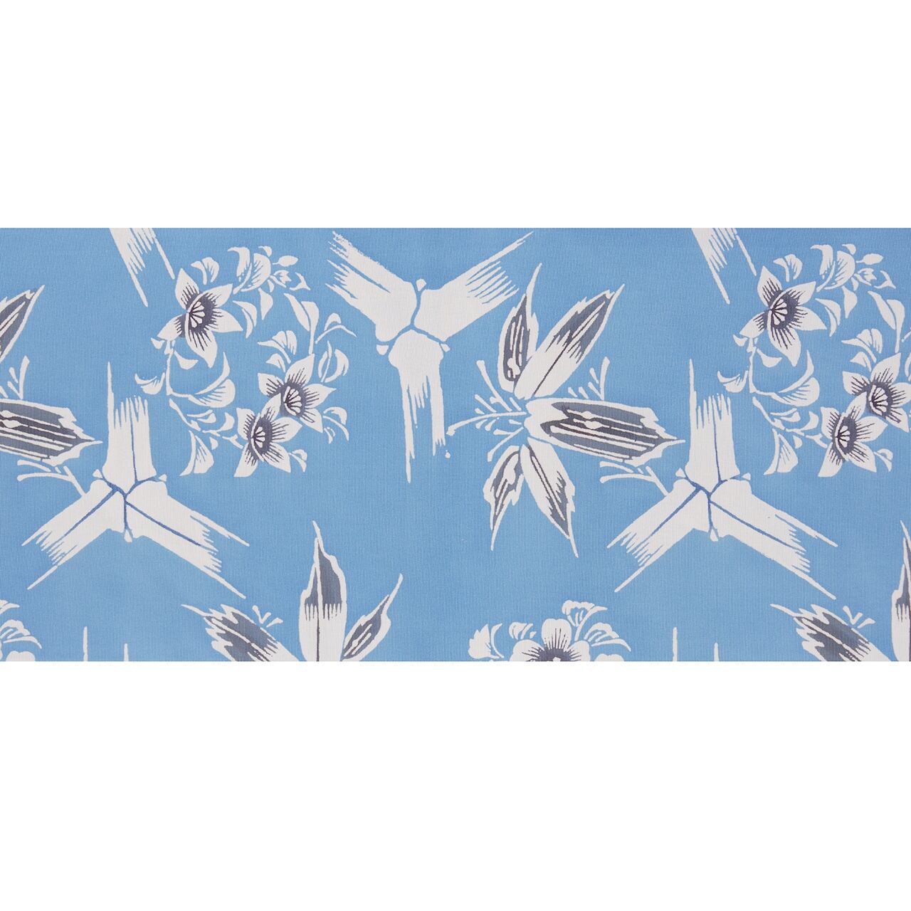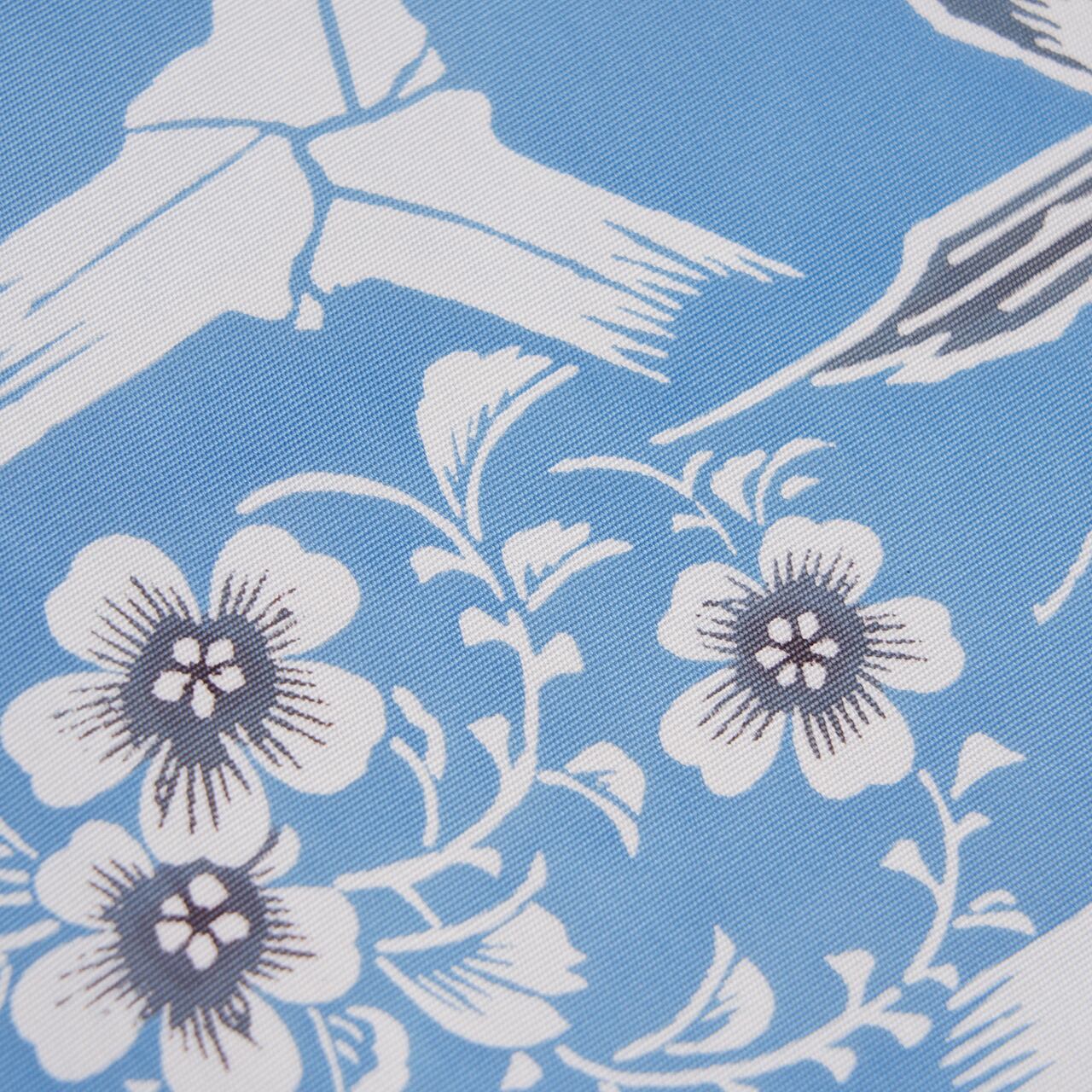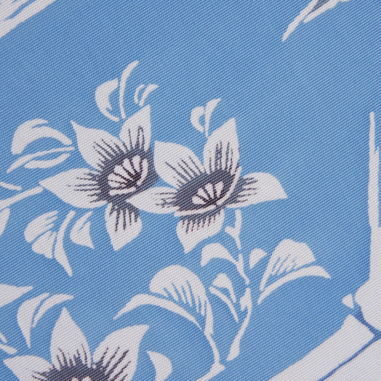 色止めの糊を置いて白く染め抜かれた竹やお花の模様が、藍の浸け染めをされることによって、真っ白ではなく裏側から藍が浸透して少しグレー味のある色になっているのが松原作品の特徴で、それに丹殻で葉やお花の中心を染められていることで、しっかりとした立体感が生まれているのもとても素敵です。