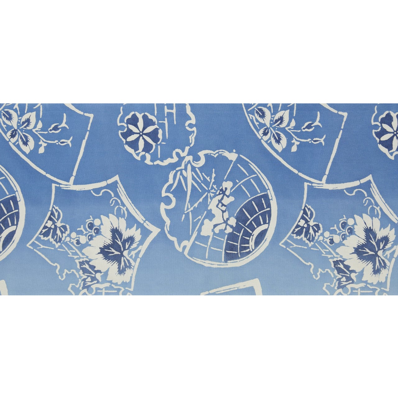 しっかりとした塩瀬の生地が少し濃いめの青・御召御納戸色から、淡い藍・浅縹色へのグラデーションに染められ、そこに扇面や雪輪、六角形、地球儀のような形などいろいろな形が染め抜かれ、その中には葡萄、蔓薔薇、朝顔などのお花、碁石が並んだものや、地球儀の中には地図のような模様と大日本やアジアなどの文字も描かれていたりする、ユニークな模様の素敵な九寸名古屋帯です。