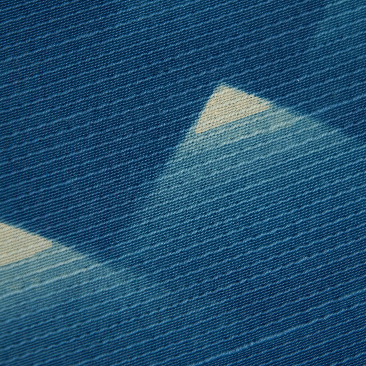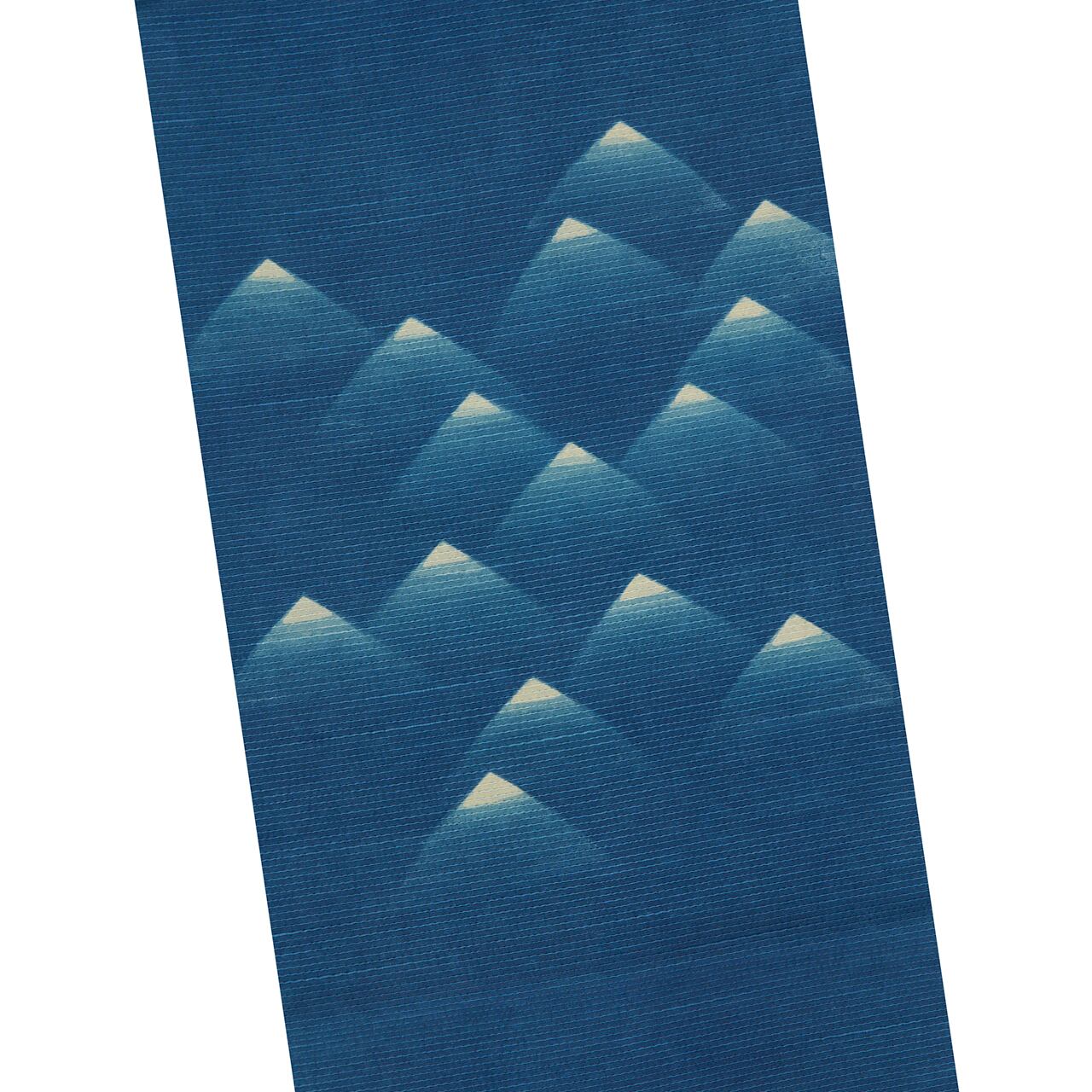 緯糸に少し太い糸が織り込まれた紅梅織のような紬地が、中間の濃さの藍・青藍色の藍に染められ、お太鼓には連なる山々に陽が射し始めたような図案がグラデーションで染められた、素晴らしい繧繝彩色藍形染の九寸名古屋帯の作品です。