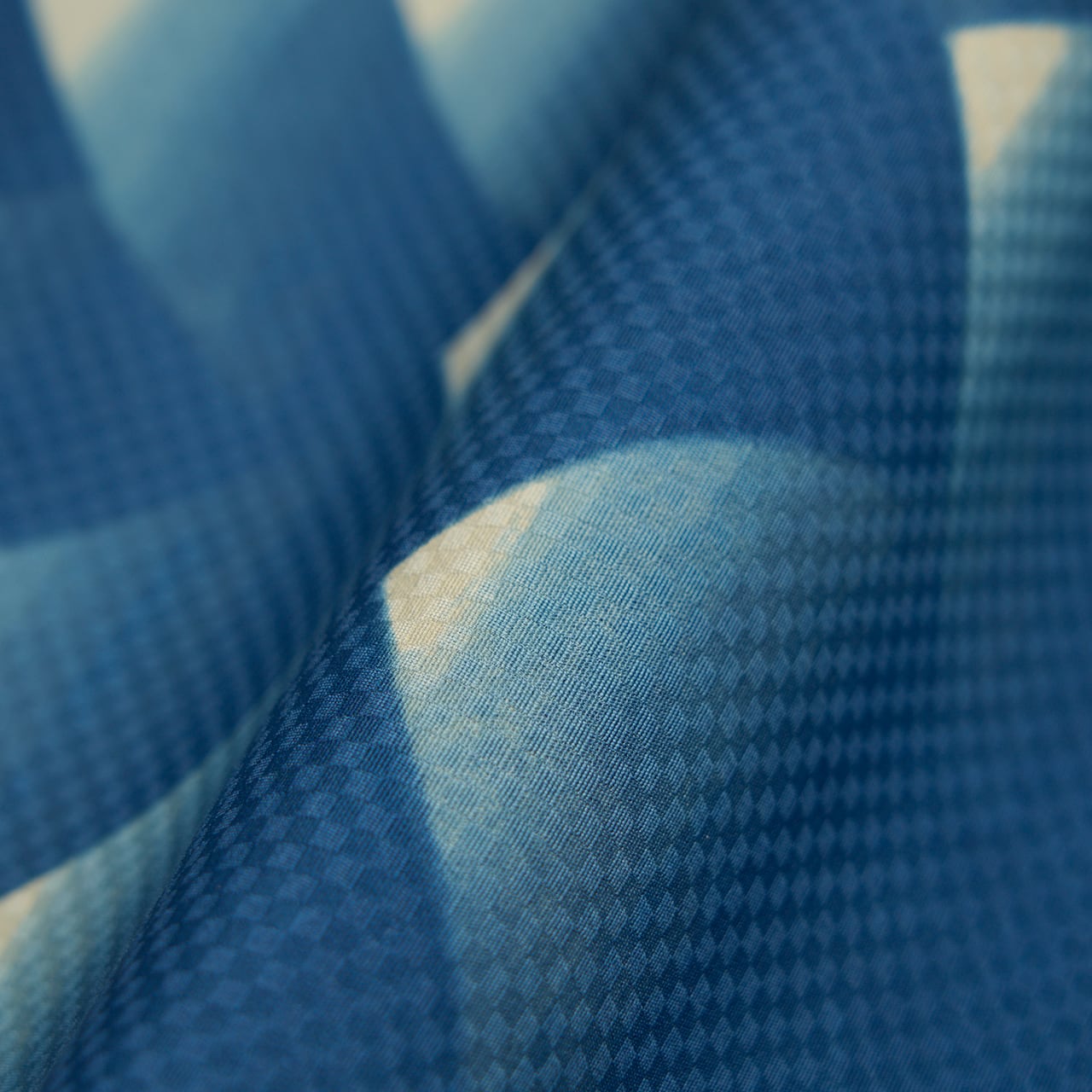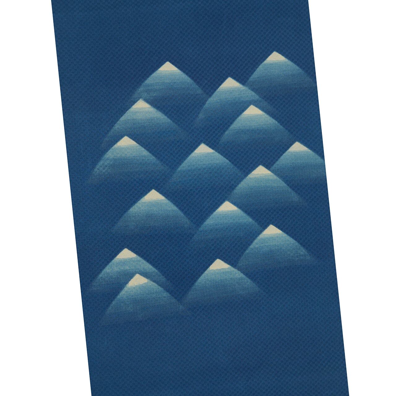 とても小さな市松の地模様が織られた生地が中間の藍・青藍色に染められ、お太鼓には連なる山々に陽が射し始めたような図案がグラデーションで染められた、素晴らしい繧繝彩色藍形染の九寸名古屋帯の作品です。