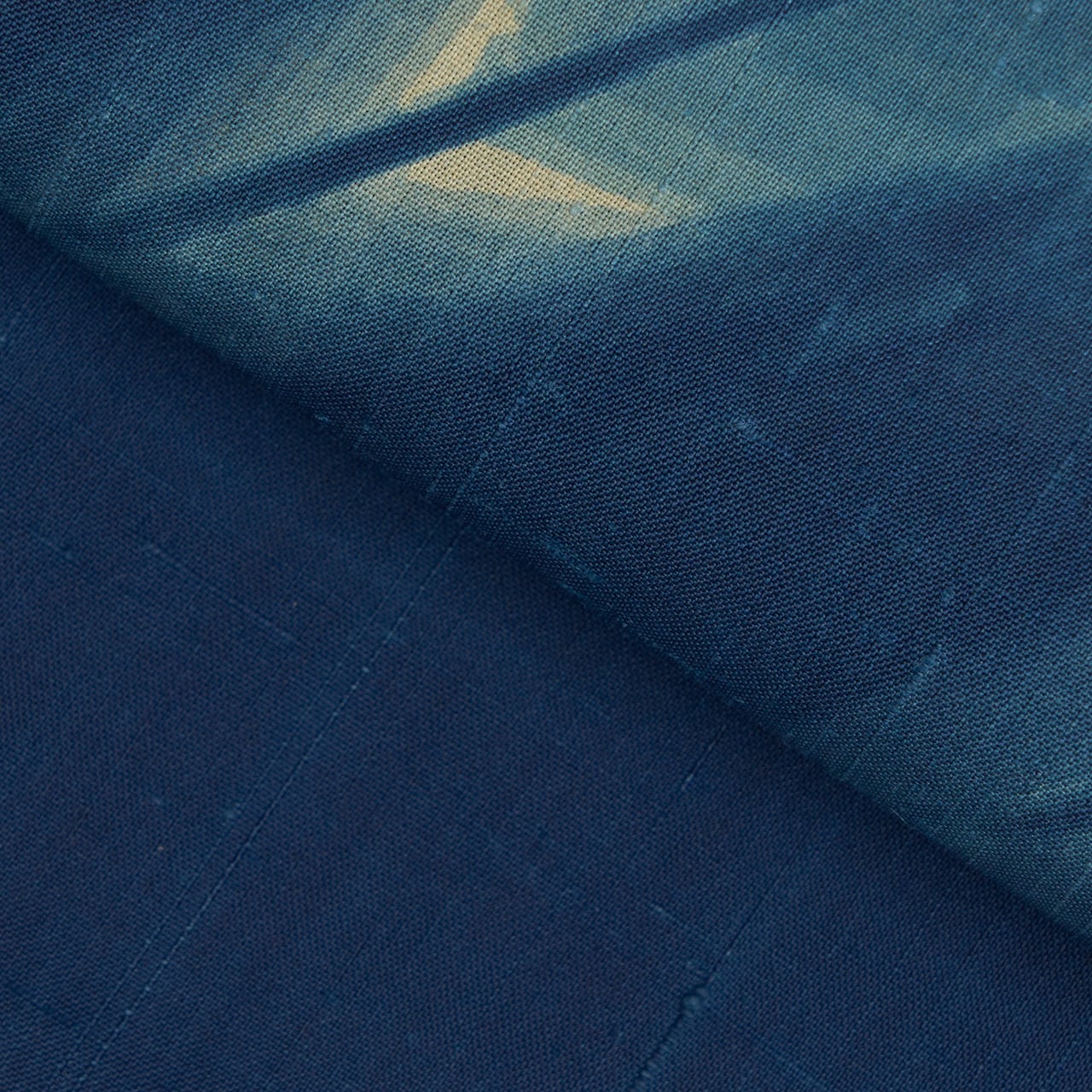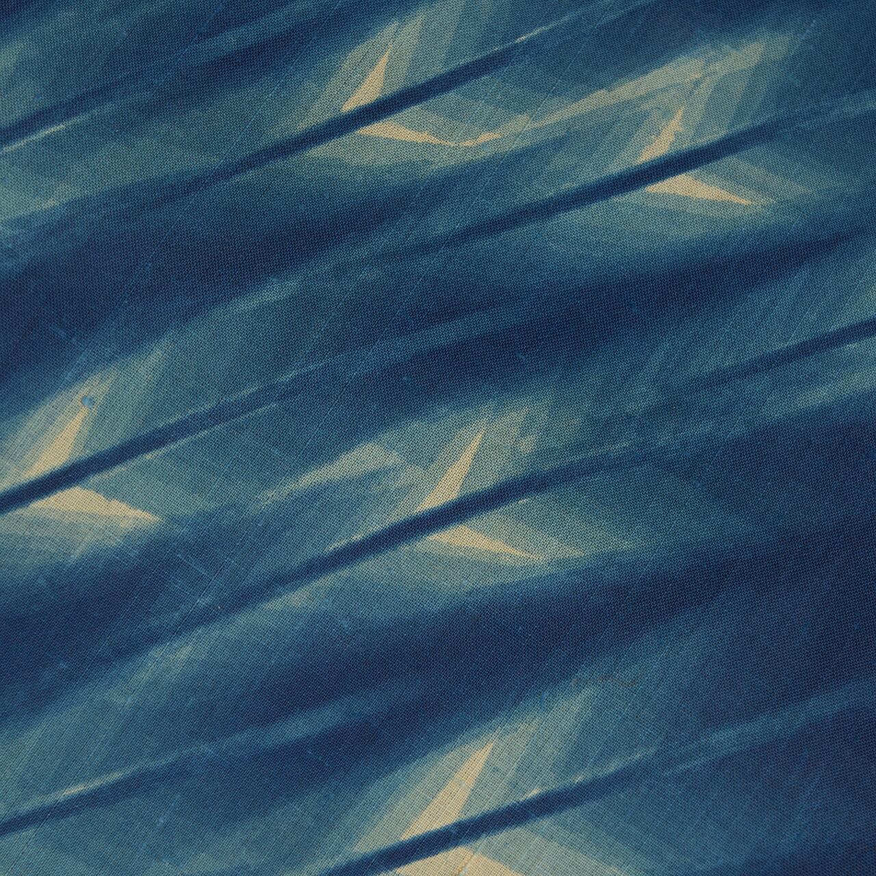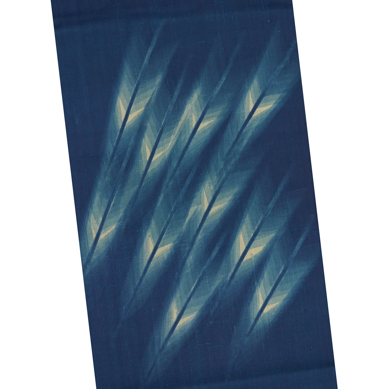 経緯に少しだけ節の見られるシャリっとした質感の紬地が、中間の濃さの藍・青藍色に染められ、お太鼓には矢羽根の模様が綺麗に並んでグラデーションで染められた、躍動感のある素晴らしい繧繝彩色藍形染の九寸名古屋帯の作品です。