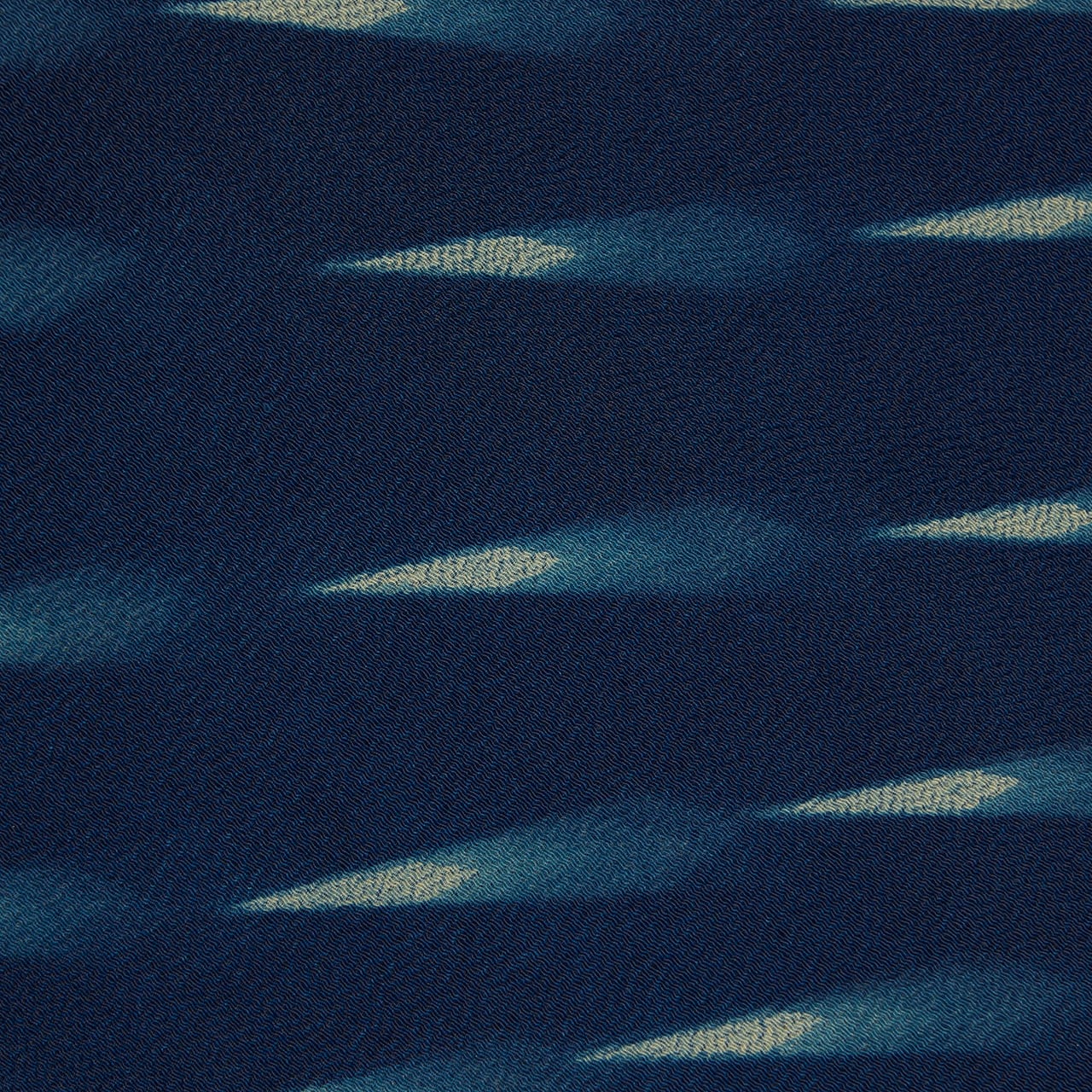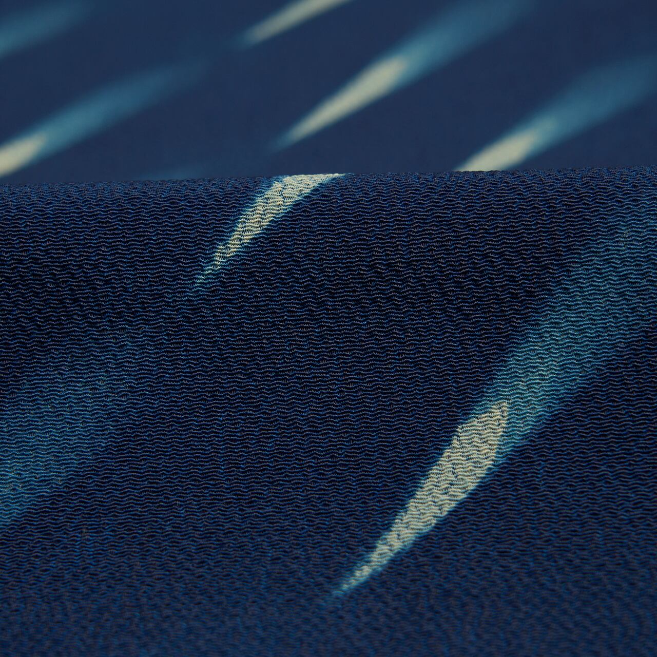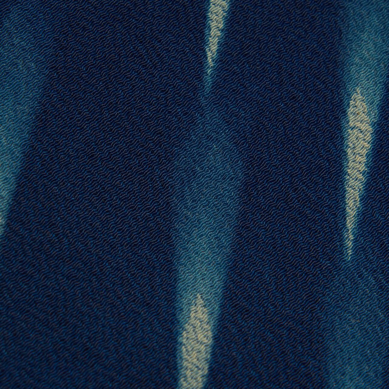 少しシボのあるちりめんの生地がやや濃い藍・鉄紺色に染められ、お太鼓には流れ星のような、右側から流れるように左へ落ちていくシャープな模様がグラデーションで染められた、躍動感のある素晴らしい繧繝彩色藍形染の九寸名古屋帯の作品です。