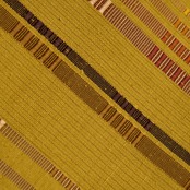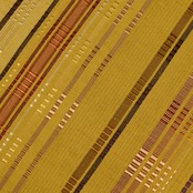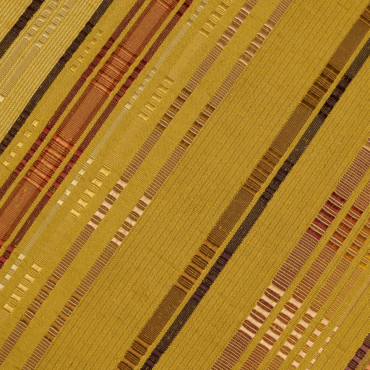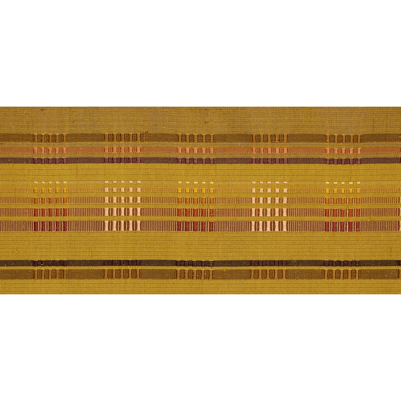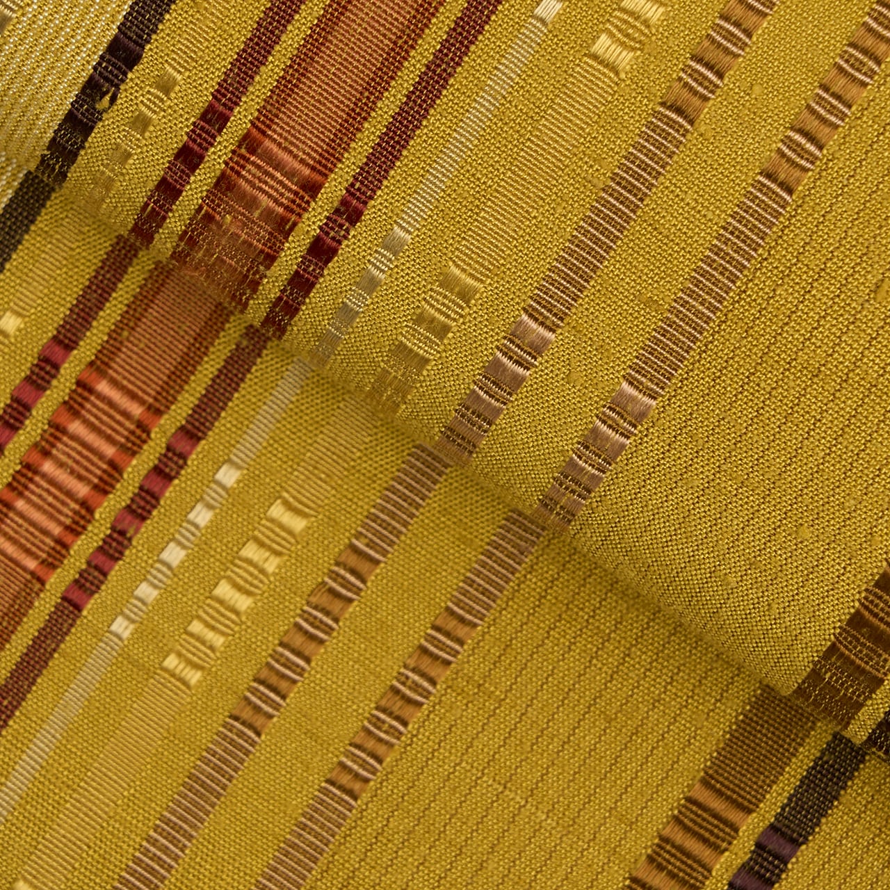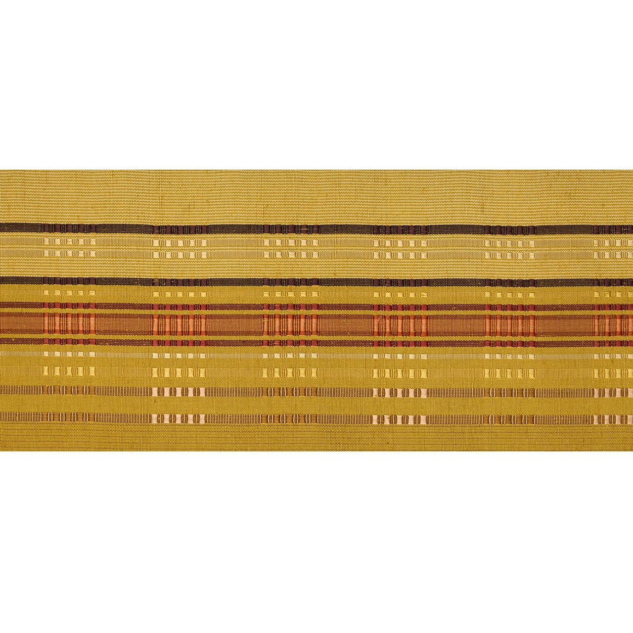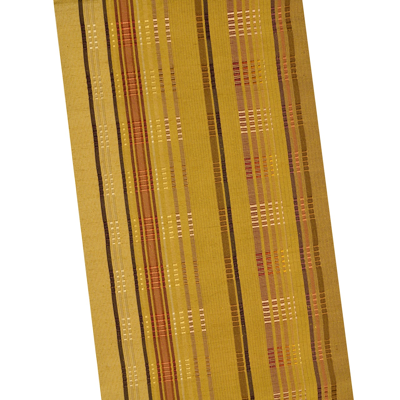 右側の黄色味のある薄茶・桑染色から、左に向かってもう少し淡い黄茶・白橡色の暈しで織り出された紬地に、紅鳶色から灰梅色までのグラデーションと、焦げ茶色や黒鳶色の濃い色の縞模様で構成されたロートン織がランダムに織り込まれた、とてもお洒落な雰囲気の九寸名古屋帯です。