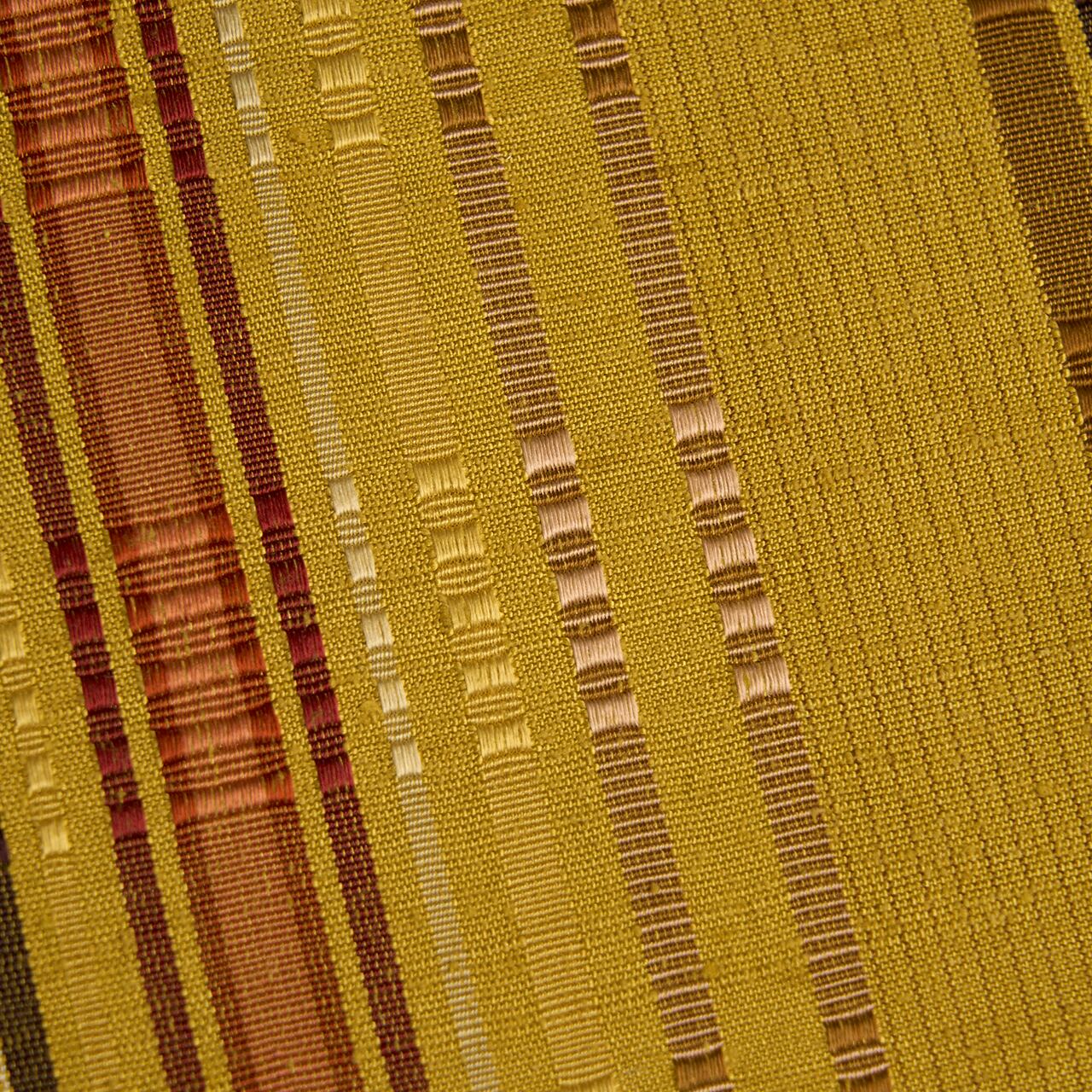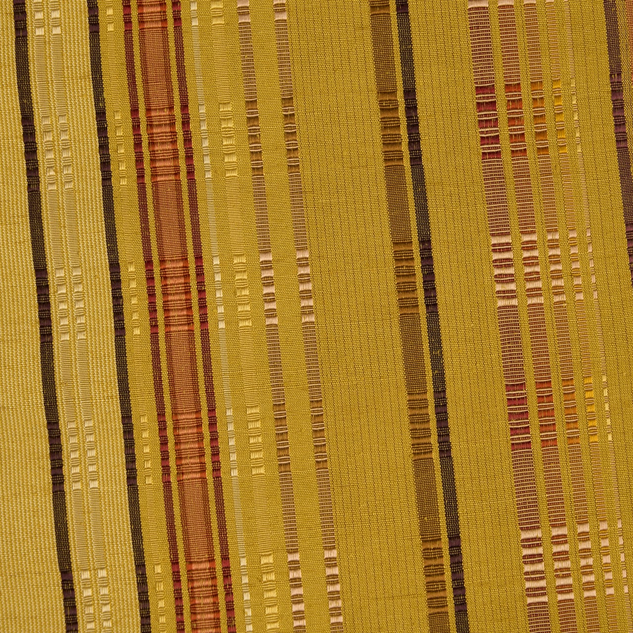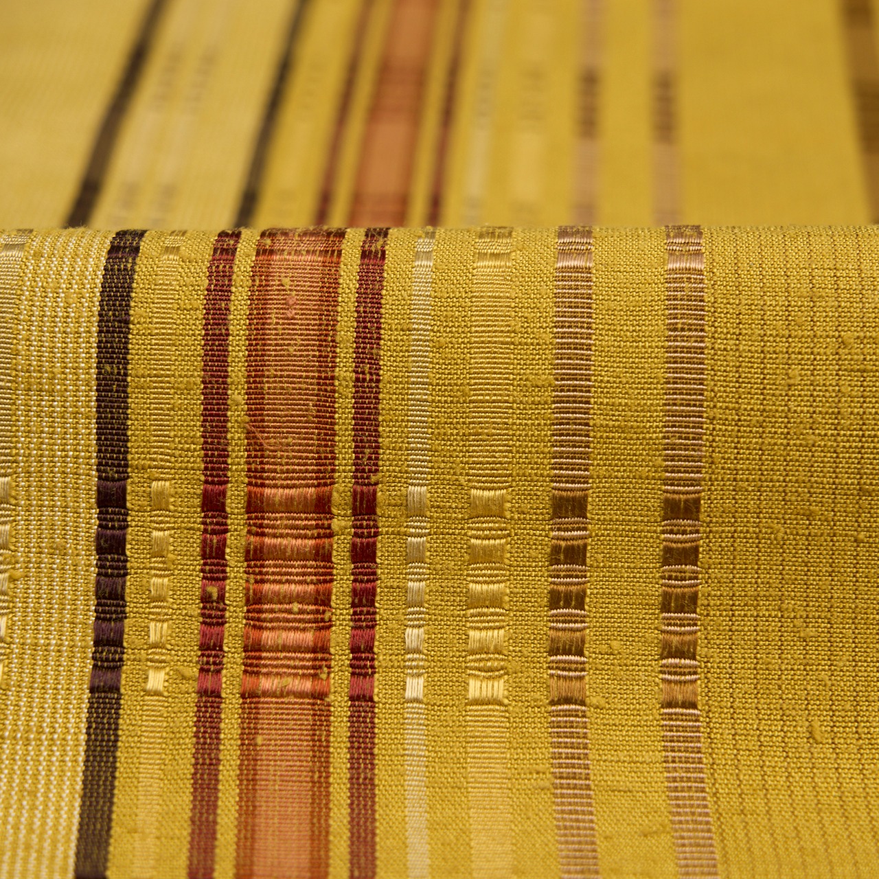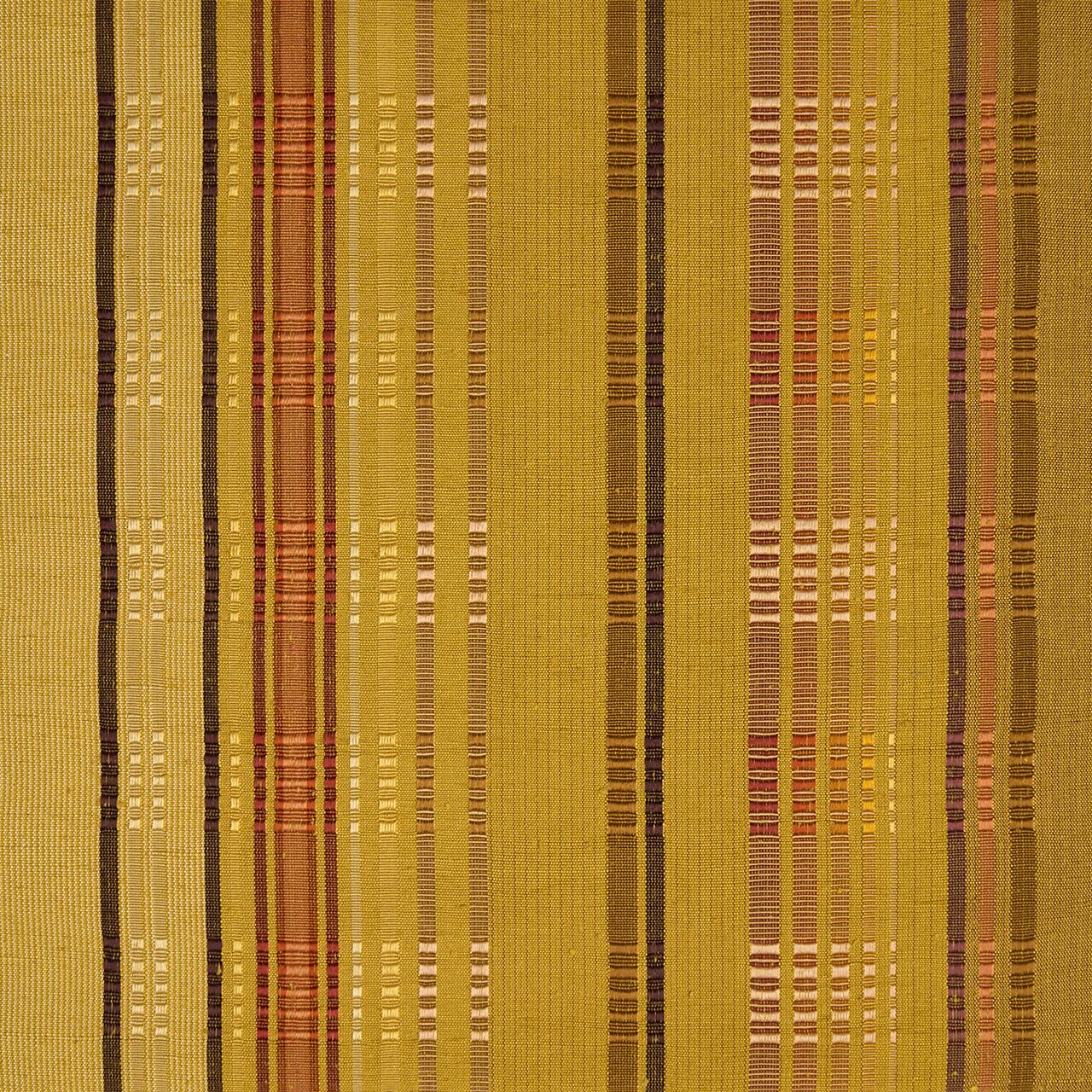紅鳶色から灰梅色までのグラデーションがとても美しく配置され、そこに焦げ茶色や黒鳶色の濃い縞がリズミカルなアクセントとなっていて、それにロートン織の浮き織の変化のある織りが綺麗な光沢を放って、全体に工芸的でお洒落な雰囲気を醸し出しています。