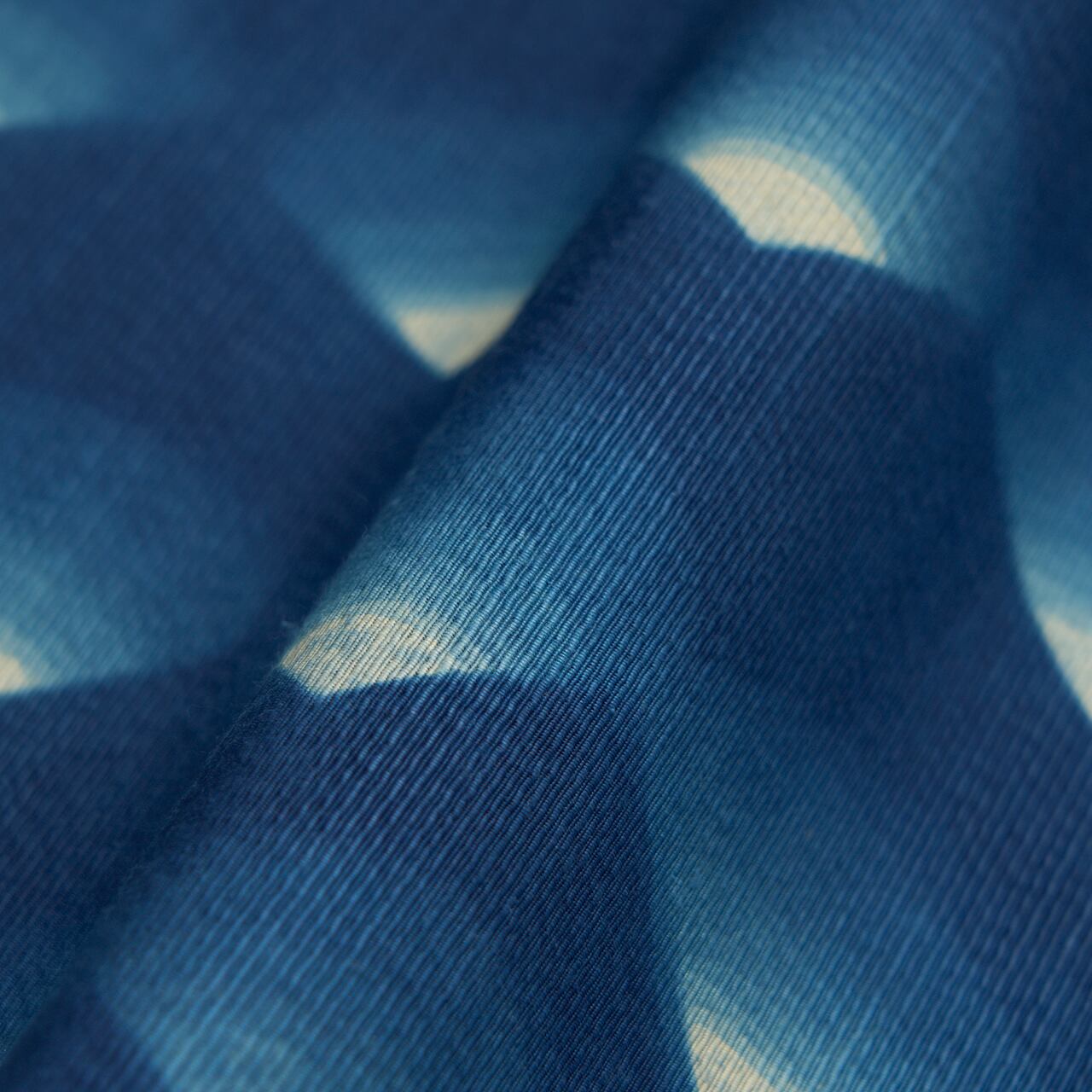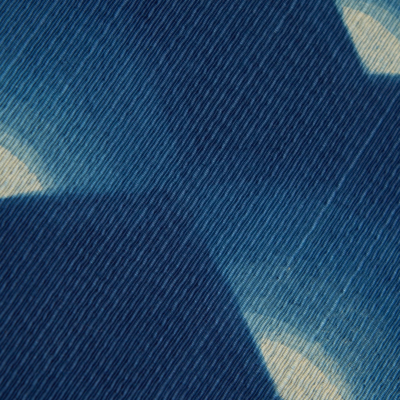 幾重にも重なる藍の濃淡が奏でる繧繝(うんげん)の染め色の妙味は素晴らしく、色相の数だけ型を取り換え、糊を置いては染める、を何十回も繰り返し生まれてくる模様です。