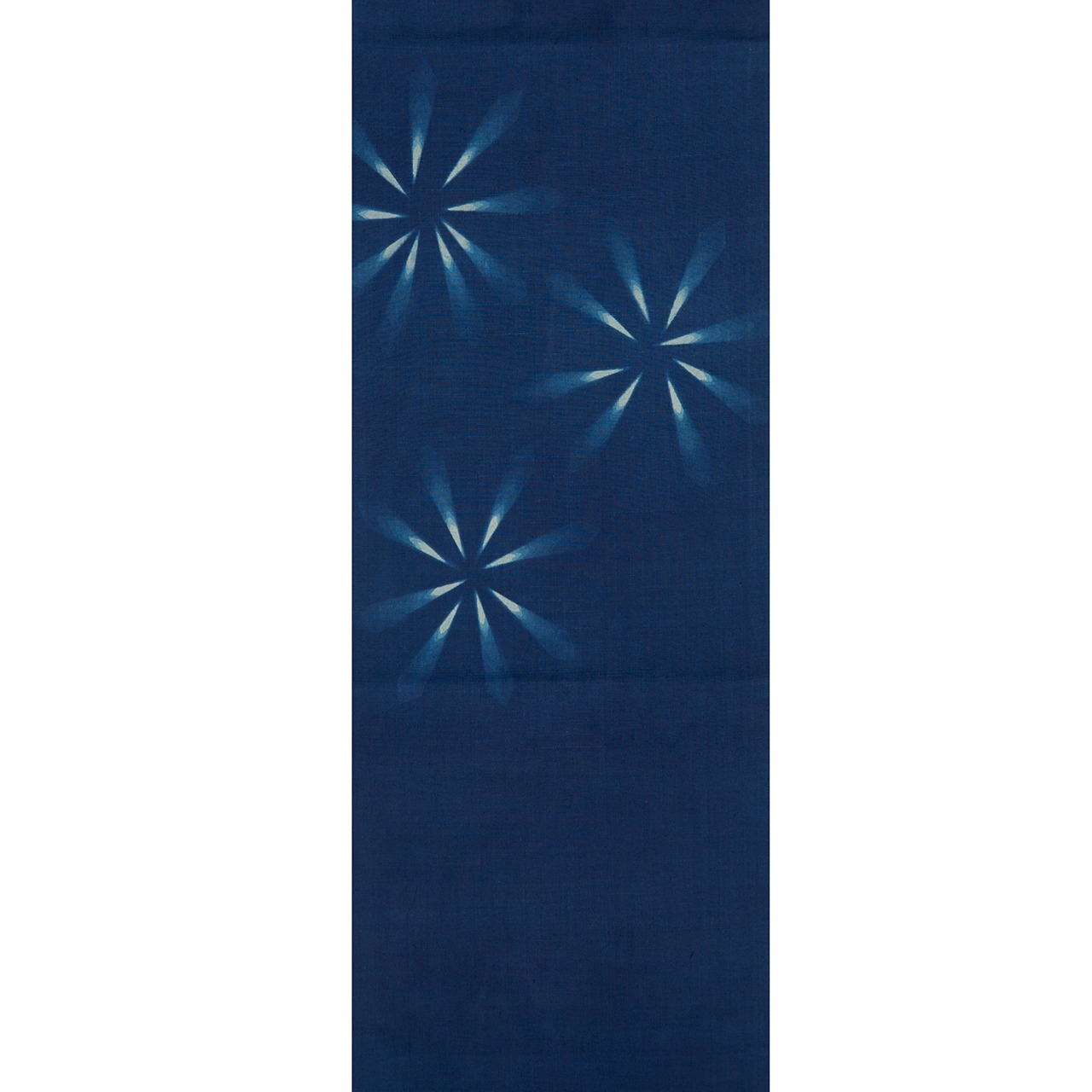 幾重にも重なる藍の濃淡が奏でる繧繝(うんげん)の染め色の妙味は素晴らしく、色相の数だけ型を取り換え、糊を置いては染める、を何十回も繰り返し生まれてくる模様です。