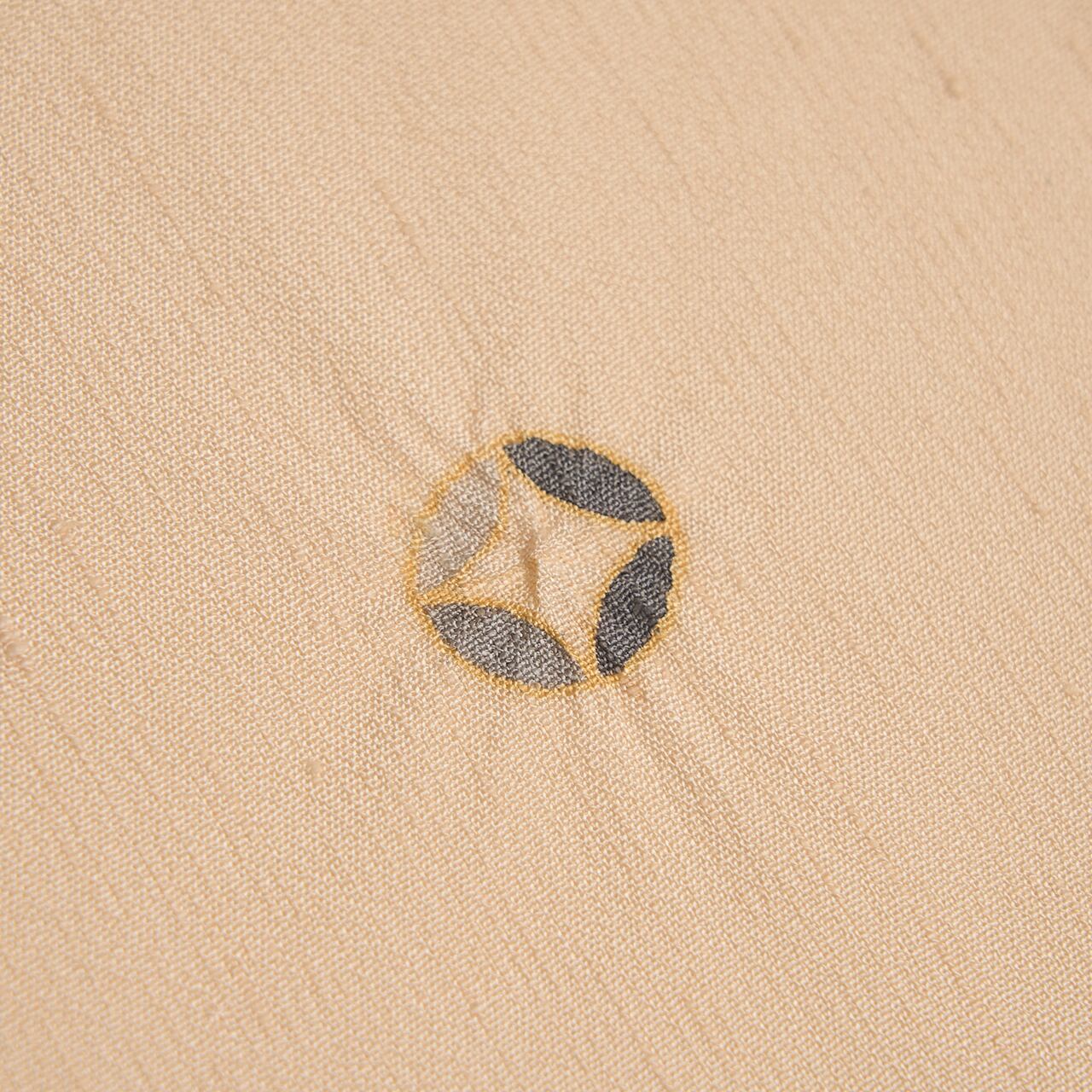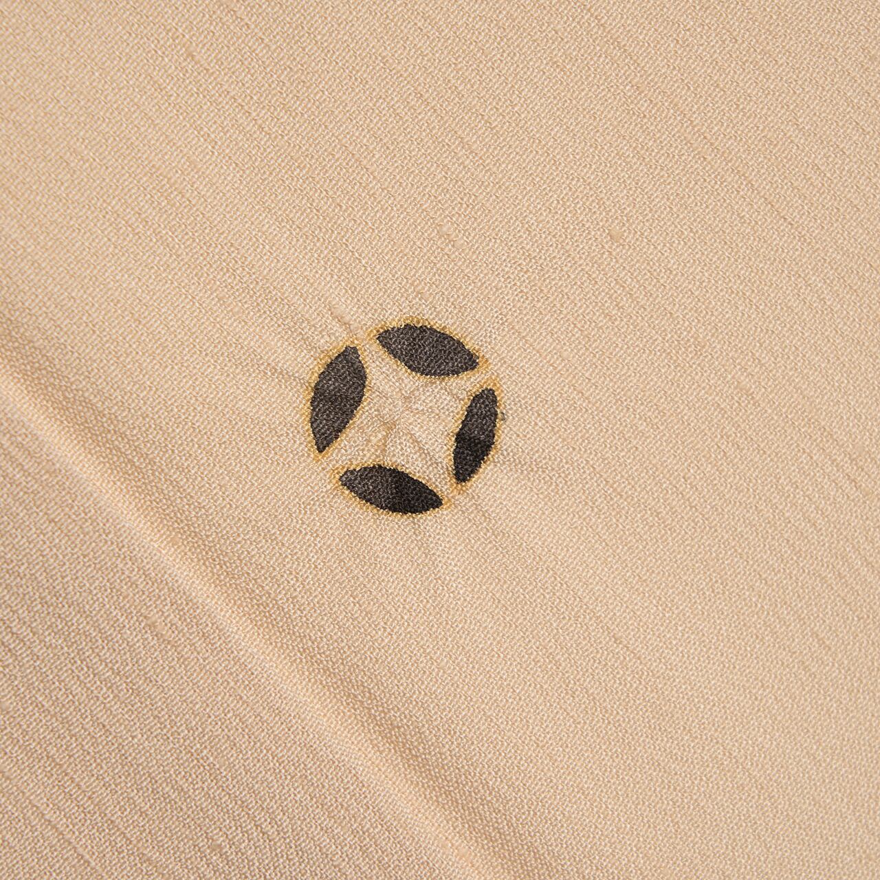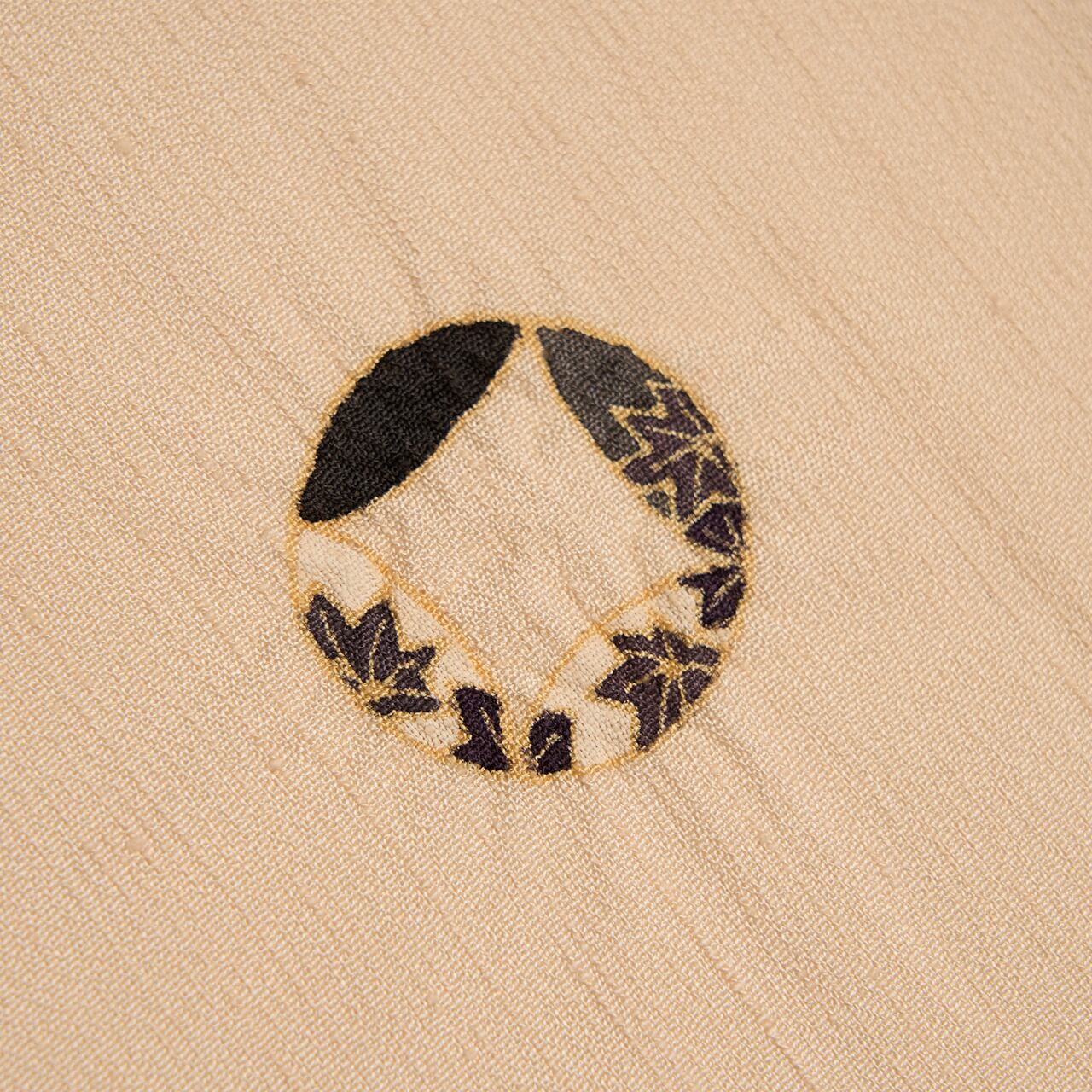 小千谷で織られていた彩雪縮緬という上質でしなやかな紬ちりめんの生地が、少しだけオレンジ味のあるベージュ・浅黄色に染められ、飛び飛びに大小の七宝の模様が絞り染めで染め抜かれ、赤味のある焦げ茶・赤墨色や灰青色、鈍色に染められた、とても品格のある佇まいとなった素敵な小紋のお着物です。