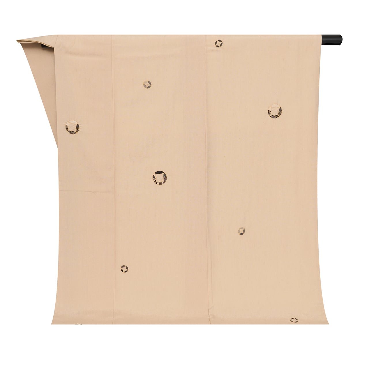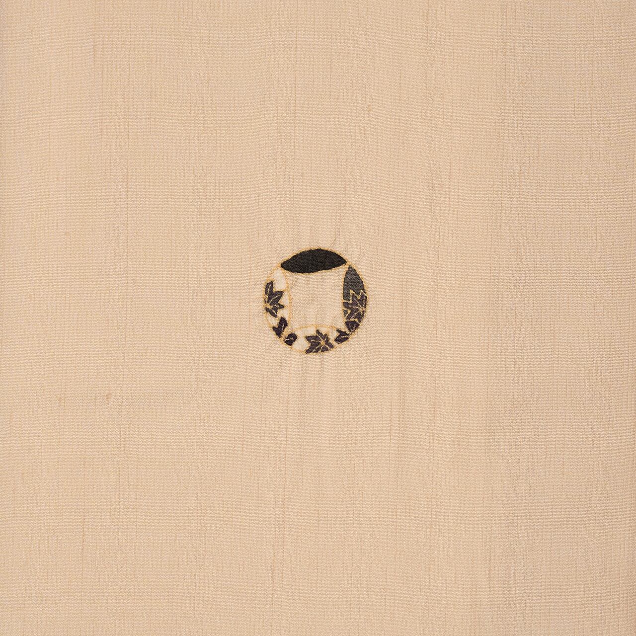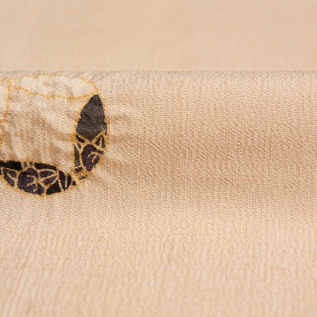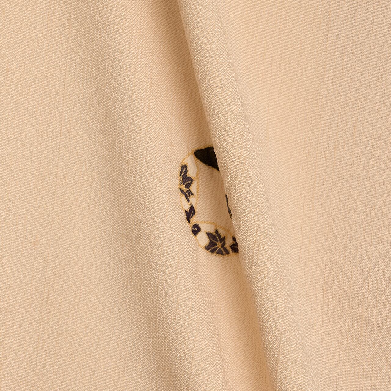 小千谷で織られていた彩雪縮緬という上質でしなやかな紬ちりめんの生地が、少しだけオレンジ味のあるベージュ・浅黄色に染められ、飛び飛びに大小の七宝の模様が絞り染めで染め抜かれ、赤味のある焦げ茶・赤墨色や灰青色、鈍色に染められた、とても品格のある佇まいとなった素敵な小紋のお着物です。