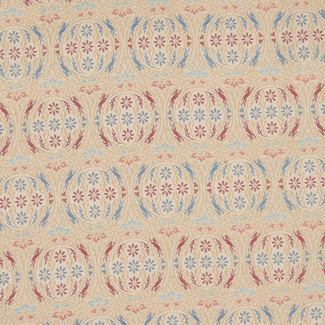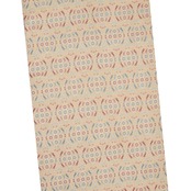 少しだけグレー味のあるベージュ・亜麻色の地に、一列に6個の大きさの丸が取られ、横には錆御納戸色のグレー味のある淡い藍色の、縦には小豆色の小さなお花が並び、周りを小さなうさぎが円を描くように取り囲む図案が繰り返し織り出された、名物裂的な雰囲気のある素敵な九寸の開名古屋帯です。