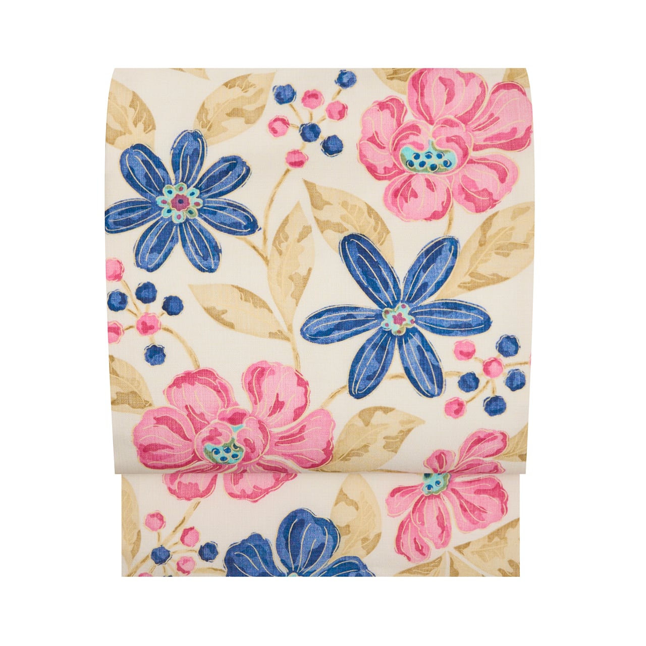 象牙色のシャリっとした質感のやや薄手の紬地に、薄紅梅色のピンクにそれより濃い中紅色で色付けされた大きなお花と、藍鉄色のマーガレットのようなお花、丸い木の実のようなものなどが、色の数だけ重ねて染める摺り友禅で描かれた、とても華やかで素敵な全通の九寸名古屋帯です。
