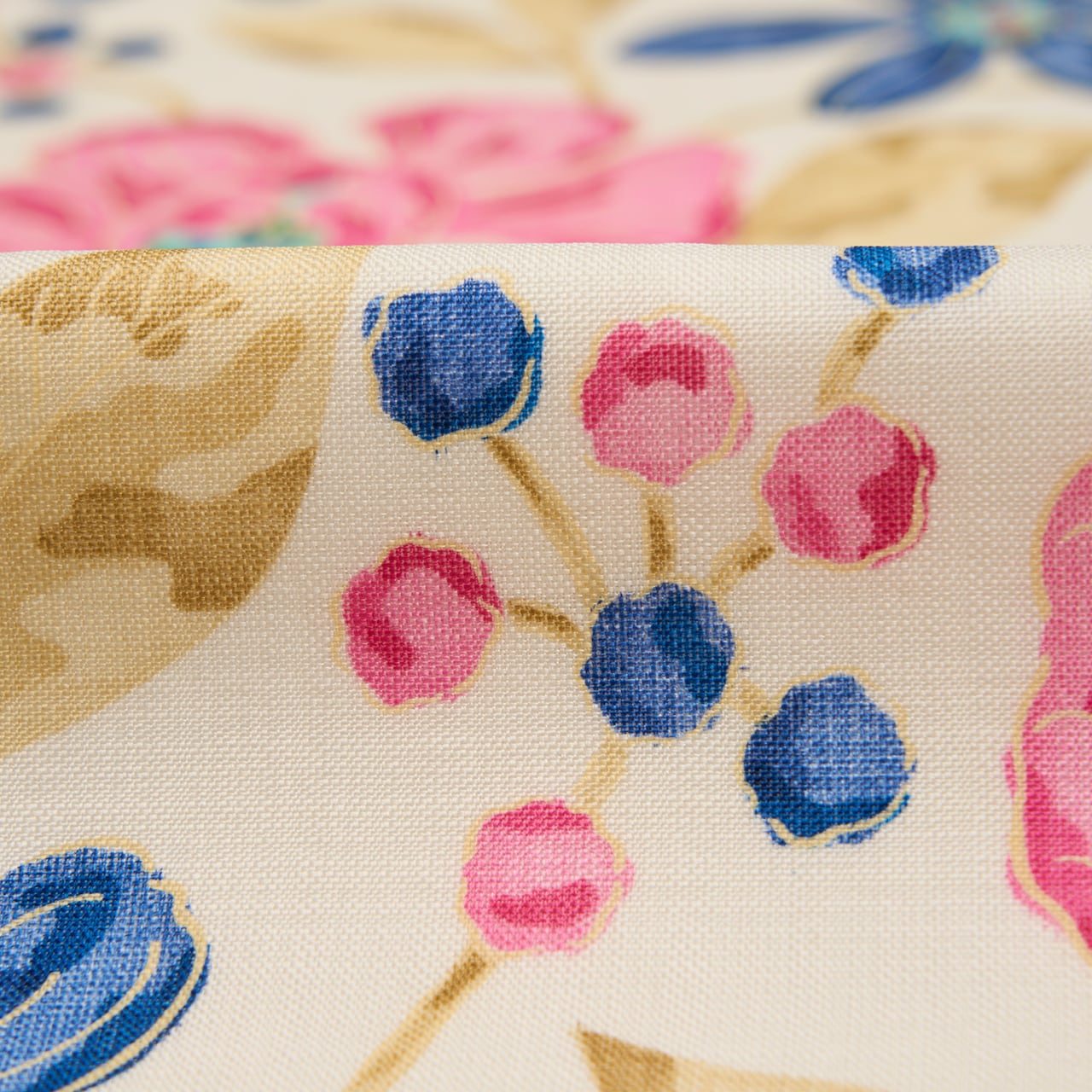 おおらかにたっぷりと描かれたお花は唐花のようでもあり、ピンクの花びらの中心には浅葱色が挿されていて、バティック的なデザインでもあり、少しエスニックな雰囲気も漂っています。
