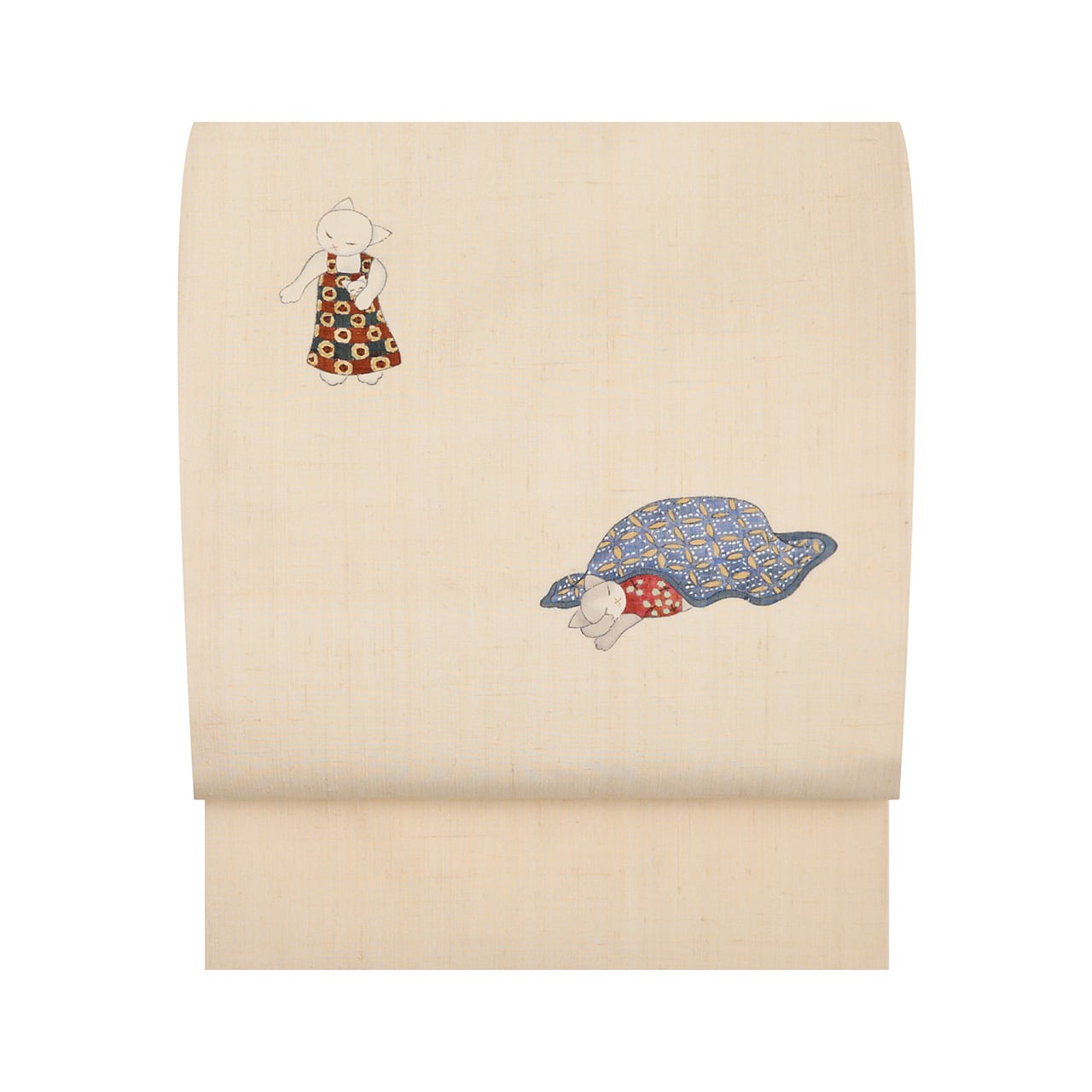 経緯に少しだけ節の見られるサラッとした質感の象牙色の紬地に、お太鼓にはお気に入りのお人形を手に持って可愛らしいワンピースを着た女の子のネコちゃんと、七宝の模様のブランケットを着てお昼寝をしている男の子のネコちゃんが友禅で描かれた、可愛らしくのどかな雰囲気の九寸名古屋帯です。