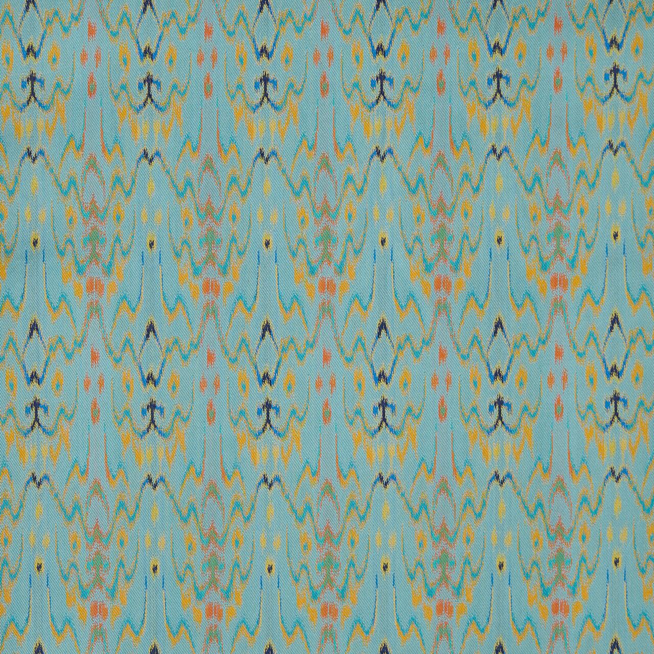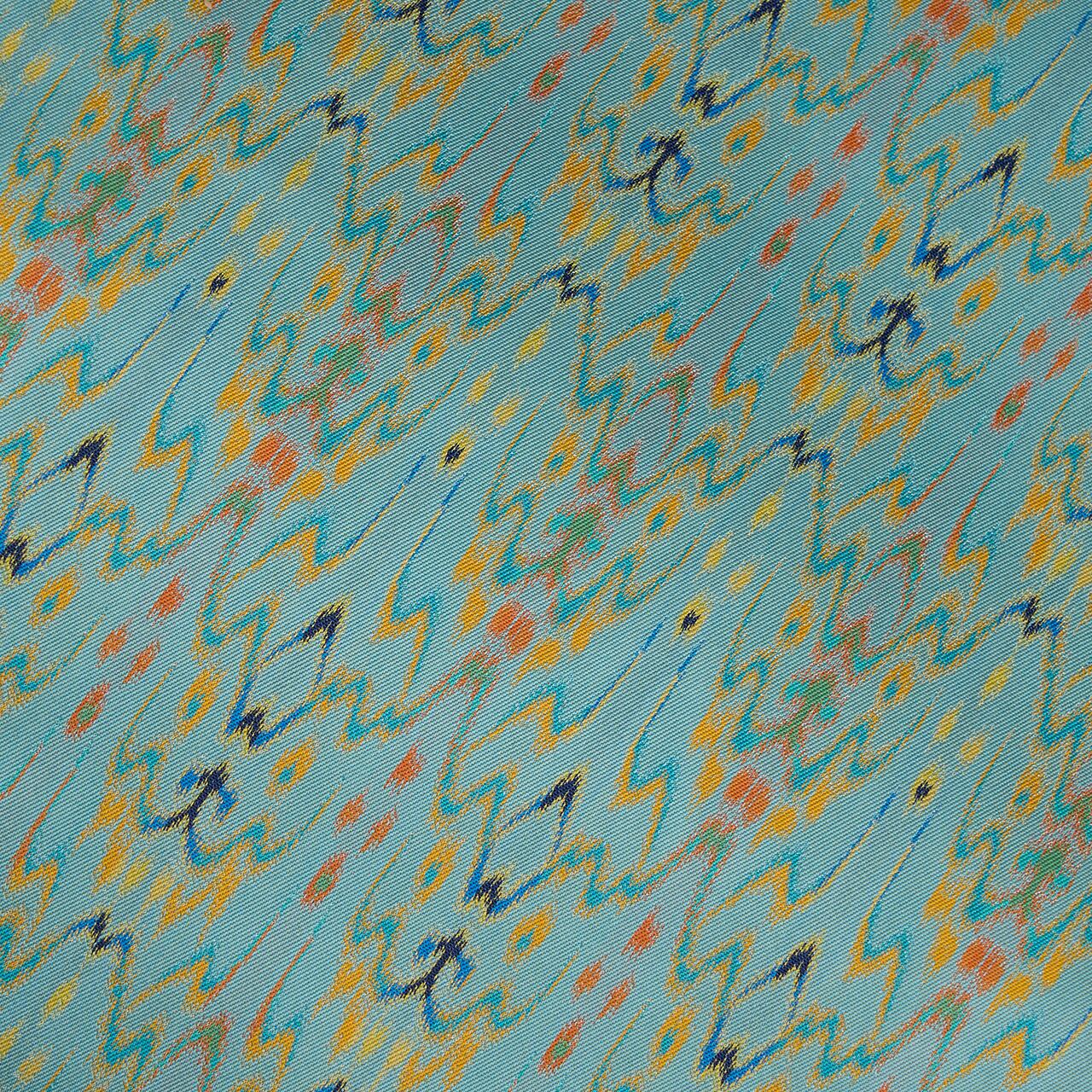 やや明るめのブルー・浅葱色の地に、太子間道の特徴的な杢目のような模様が何色もの糸を使って織り出され、それを部分的に変化させて獅噛文を加えた、龍村美術織物さんオリジナルの「獅噛太子」文様の経錦の開名古屋帯です。