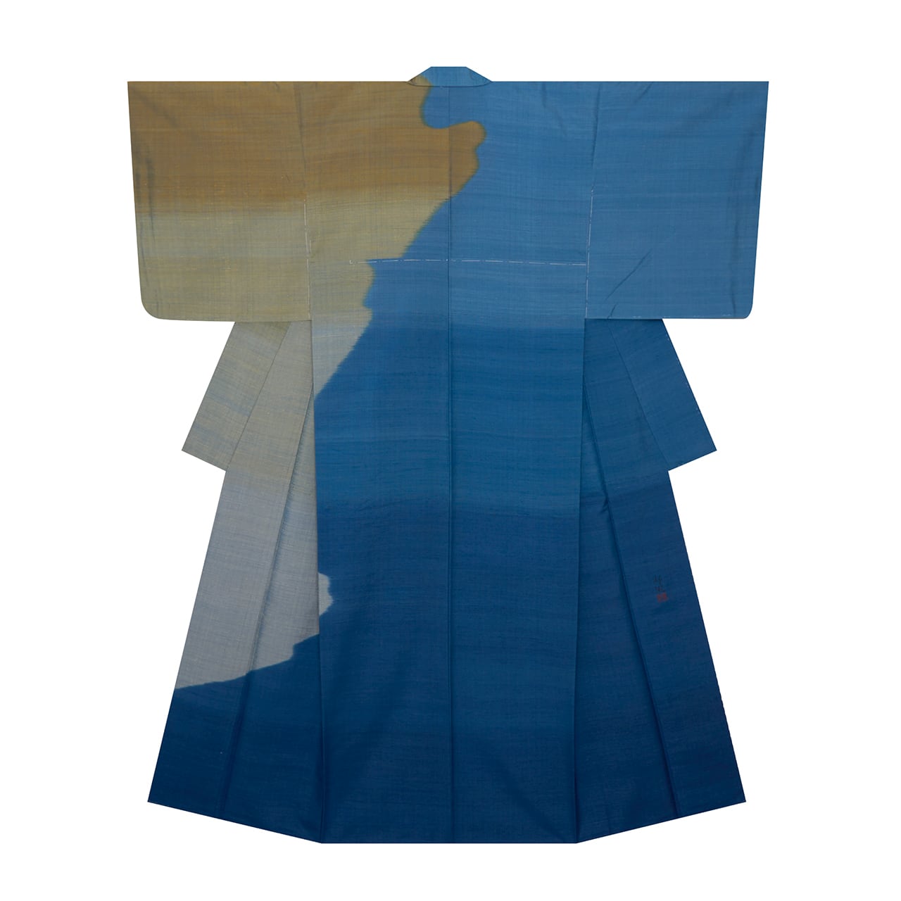 3段階の濃淡に染められた本藍染の明るめの藍色をベースにして、それ以外の部分には渋めの鶯色系の緑・麹塵色、グレー味のある薄緑・利休鼠色、そして藍味のあるグレー・灰青色というこちらも3種類の色が斜めの絣の線で織り出されて肩身変わりになった、お洒落な絵羽附けのお着物です。