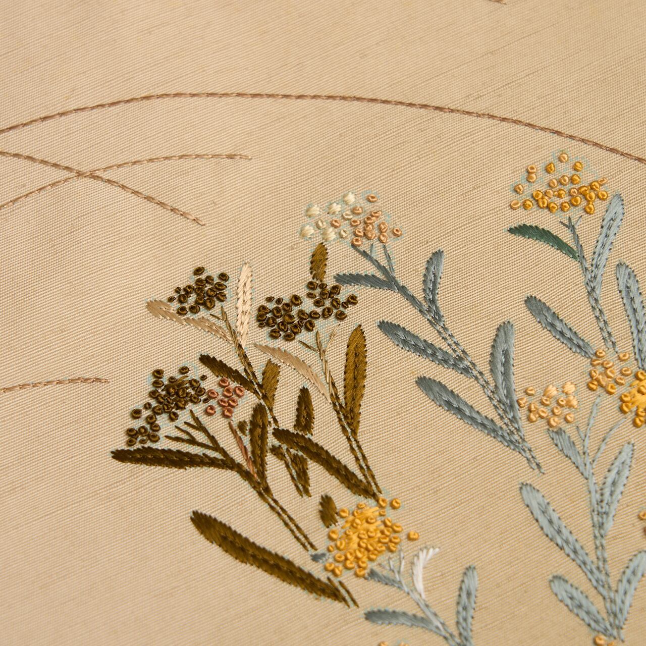 陽当たりの良い山里にひっそりと咲いている様子が描写されていて、綿毛がついている様子と、その光沢を見事に手刺繍で表されているのも素晴らしいと思います。