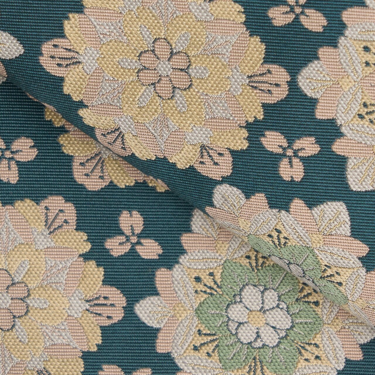 緑味のある藍・高麗納戸色の地に、一列に4個並ぶように6枚の花びらの唐花文が織り出され、その間には桜のような小さな花が散らされた、名物裂的な文様の格調高さのある素敵な九寸名古屋帯です。
