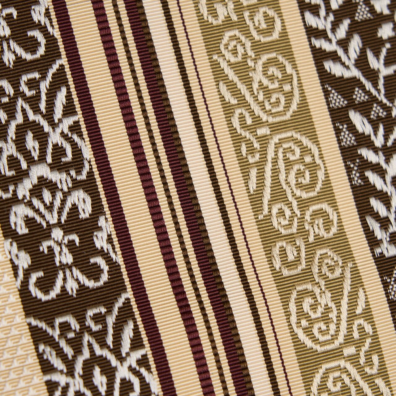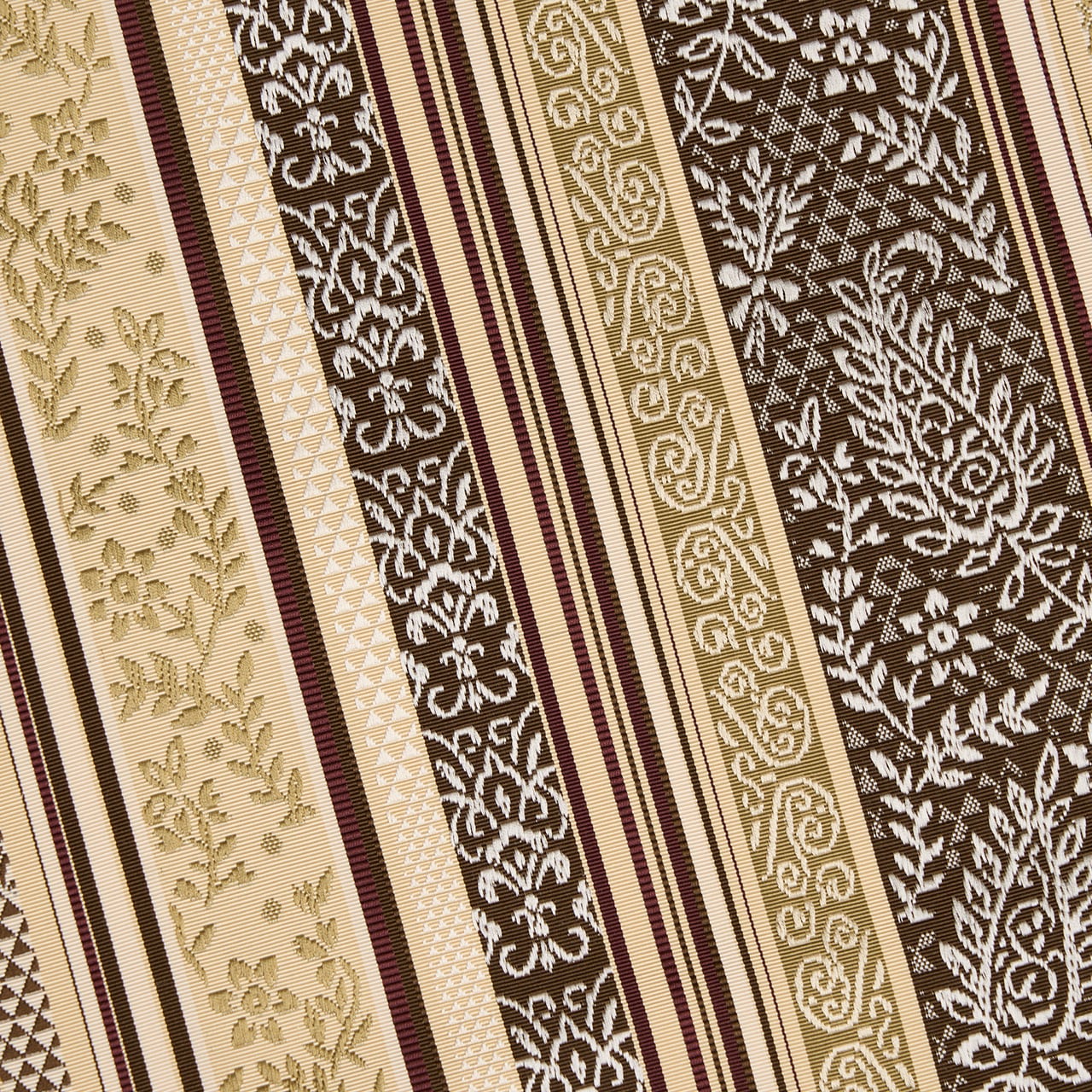 こちらは淡い色調の縞に濃い紫系の縞がアクセントとなっていて、そこに花唐草などが浮織で織られて綺麗な凹凸感があり、さりげない品格と華やかさが感じられる素敵な帯となっています。