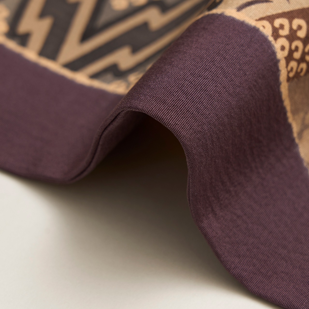 縦にシボのあるさらっとした質感の多ち花さんオリジナルの生地が、両端の5cmくらいの幅に桶絞りで黒鳶色が染め分けられ、その間には亜麻色をベースにして誰が袖模様が重なるように描かれた、雅な雰囲気の、そしてシックな色使いがとてもお洒落な九寸名古屋帯です。