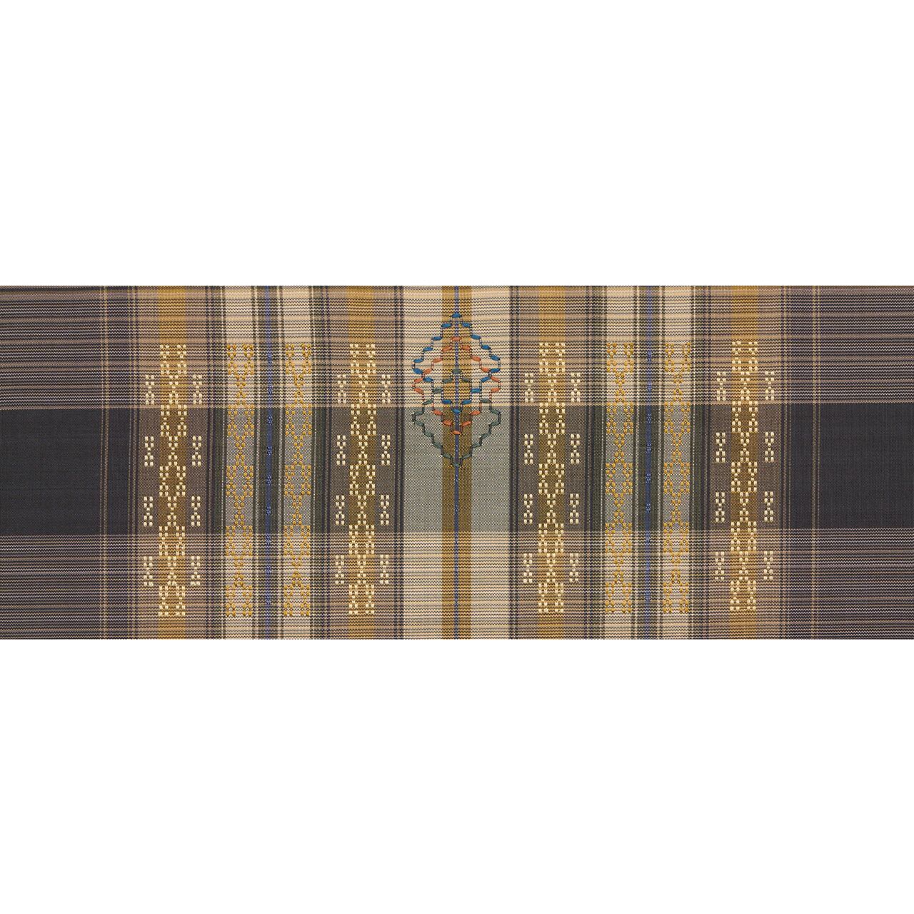 シックな色使いでありながら、縞建てのお洒落さや星のように細やかに散りばめられた小さな花織、大きめの手花織などの存在から、さりげない華やかさの光る帯となっています。