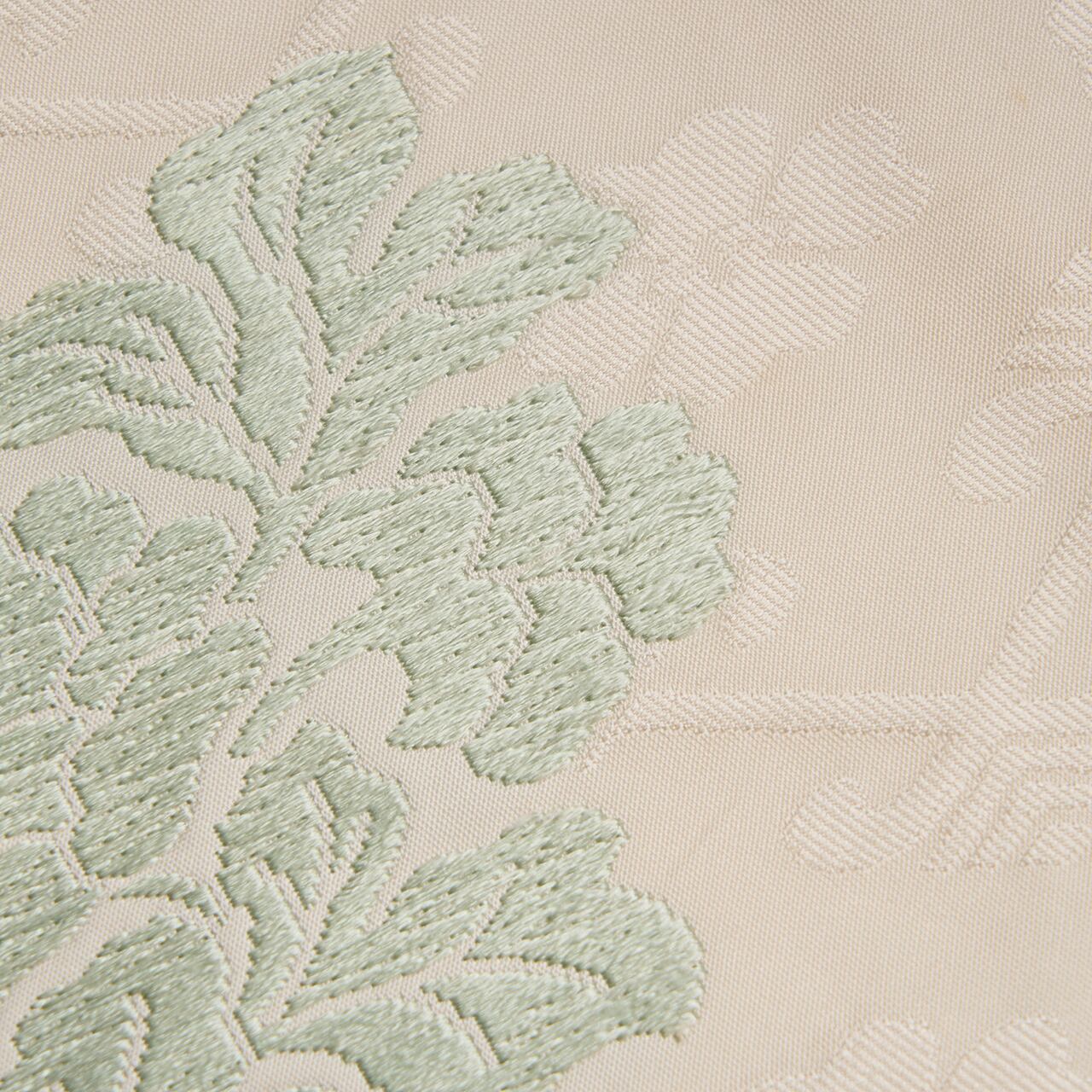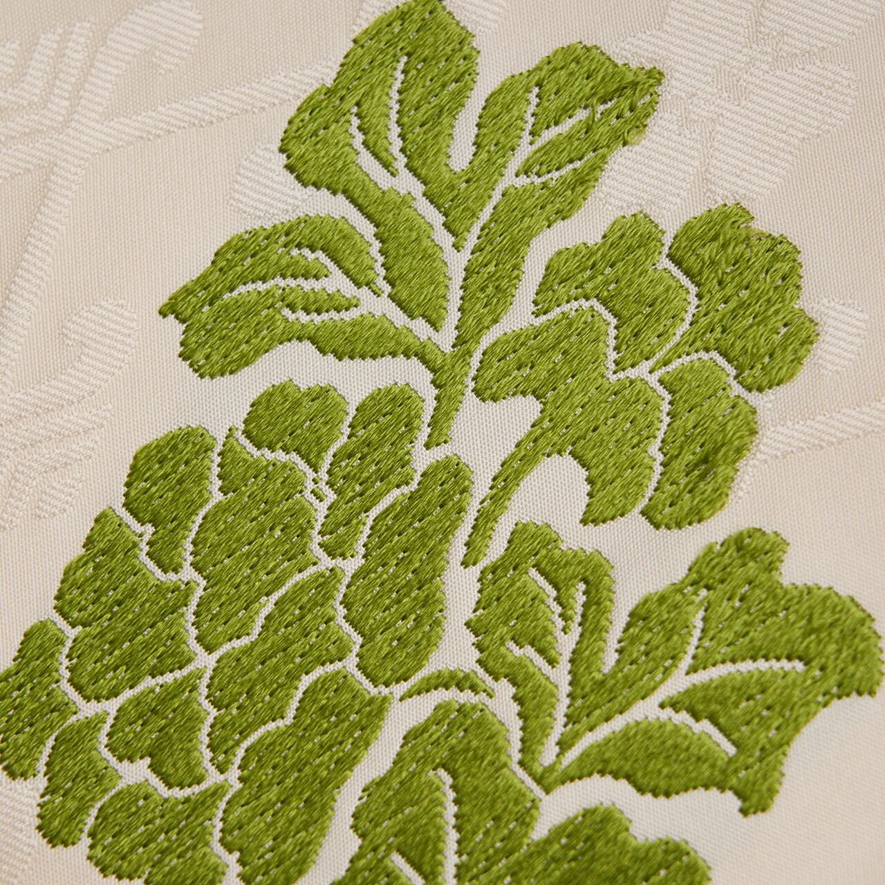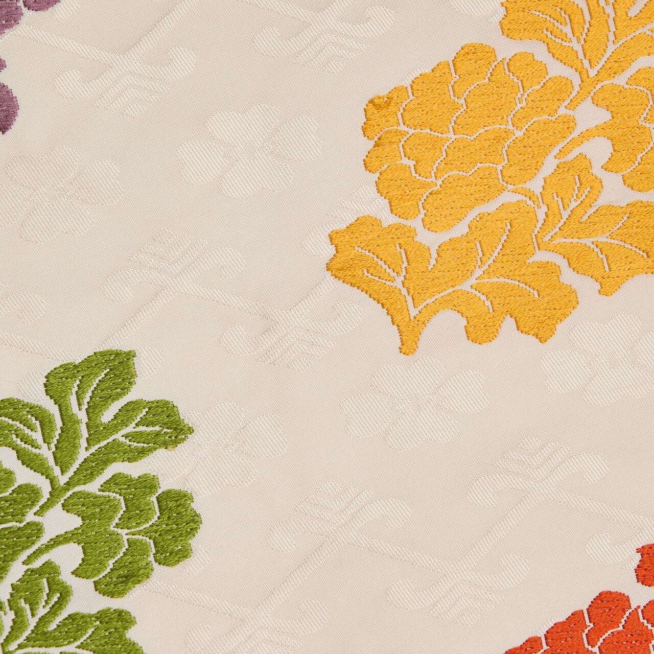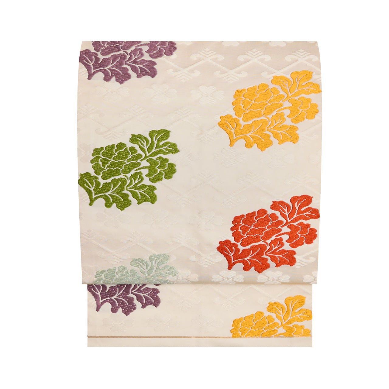 象牙色の地にジグザグとお花の模様が織り出され、そのに牡丹のお花と葉が萱草色の黄色、緑青色の緑、滅紫色の紫、淡い水色、そして赤の5色の糸で華やかに唐織された、有職文様の格調高さのある九寸名古屋帯です。
