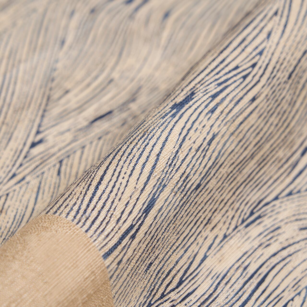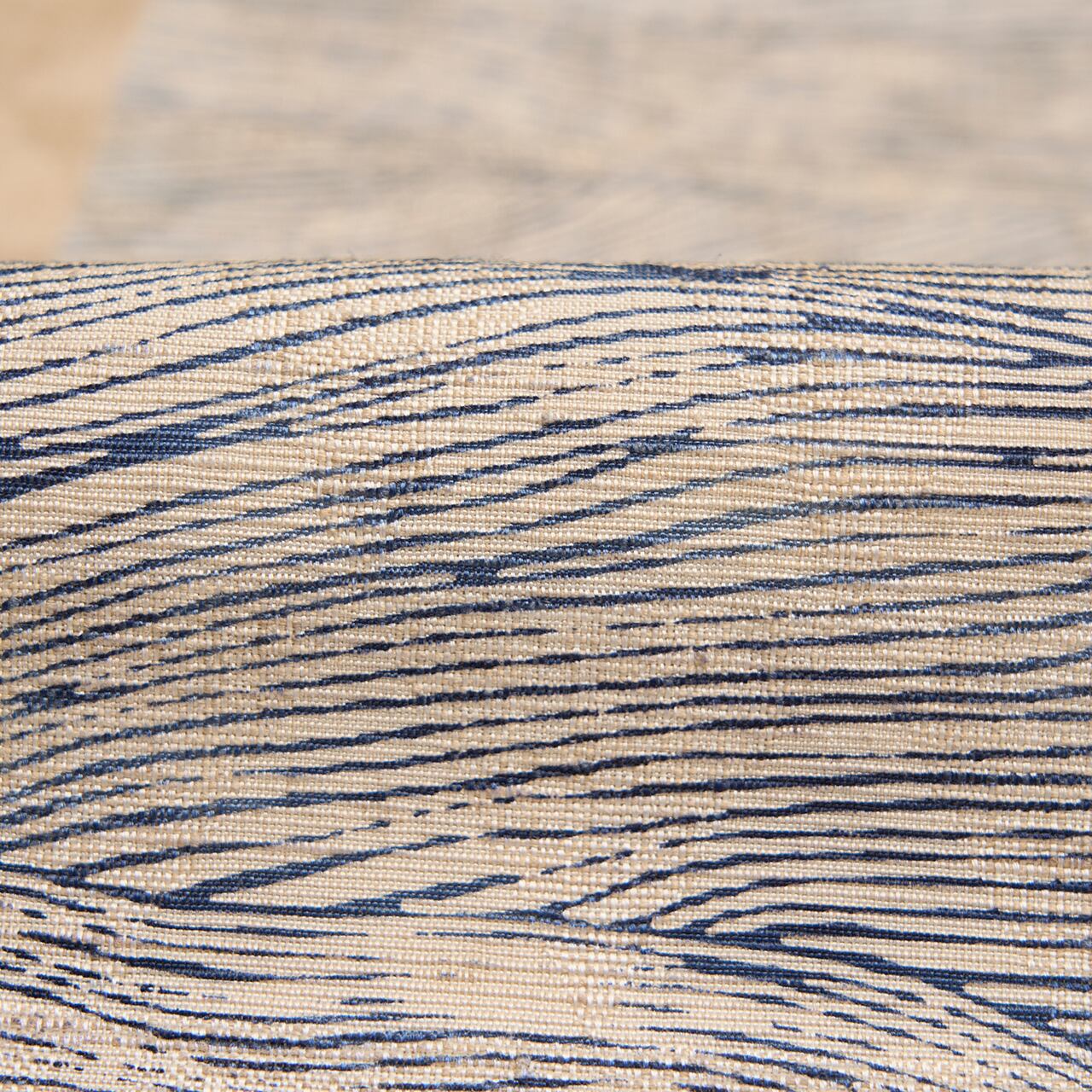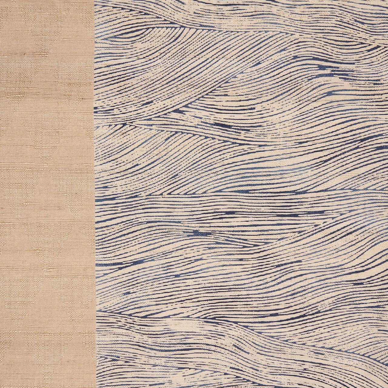 グレー味のあるベージュ・亜麻色の座繰りの生紬の糸で、三角の鱗模様が地模様のように織り出された生地に、お太鼓には右から4分の3くらいの面積に、波のうねりのような模様が紫味のある藍・青褐の染料を使って型染めで染められた、手描きのものとはまた違った良さのある、とてもすっきりとしたお洒落な九寸名古屋帯です。