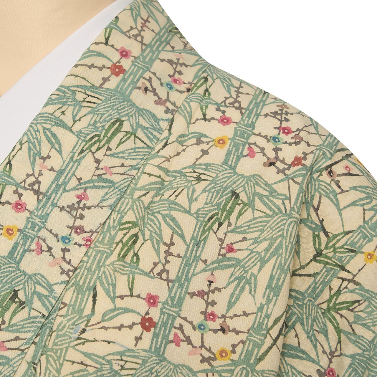 その象牙色の地に冴え冴えとした綺麗な青味のある緑色で、全体に竹林の模様が一方附の形で染められ、その竹の間から小さなお花をつけた梅が奥ゆかしく顔をのぞかせていて、さりげない可憐さと華やかさをもたらしているような、本当に素敵なお着物です。