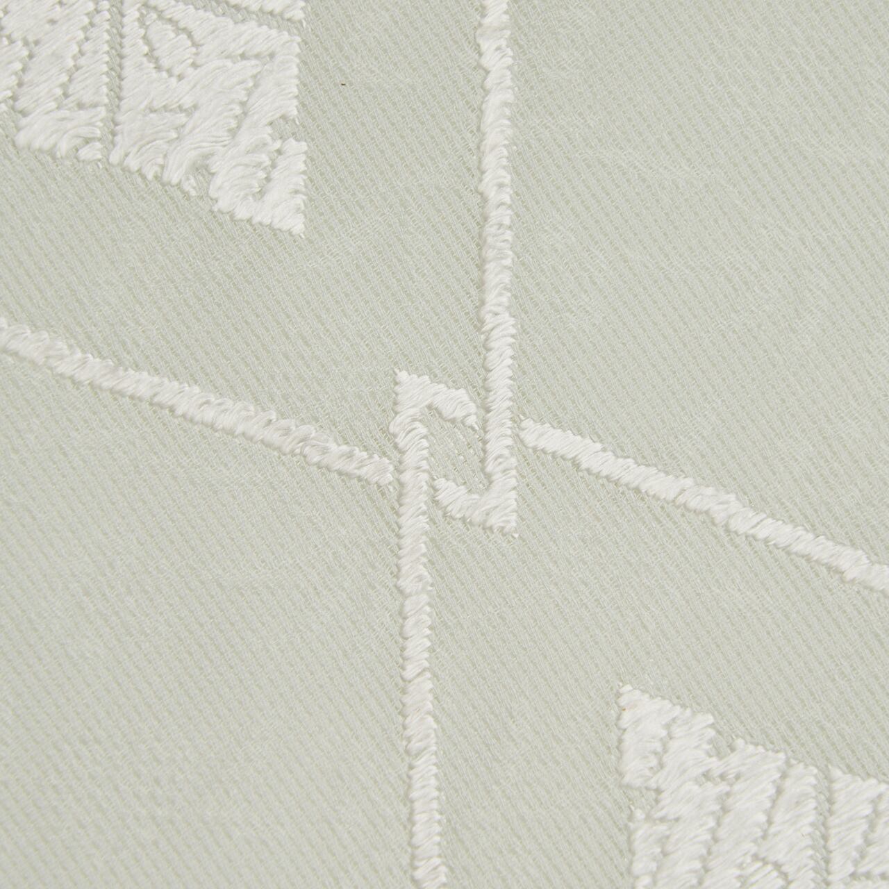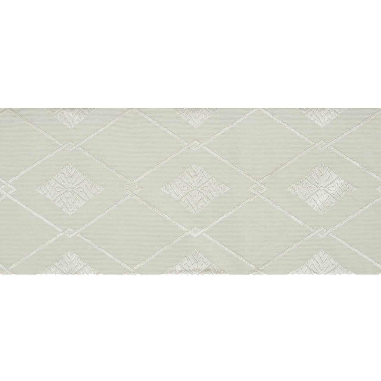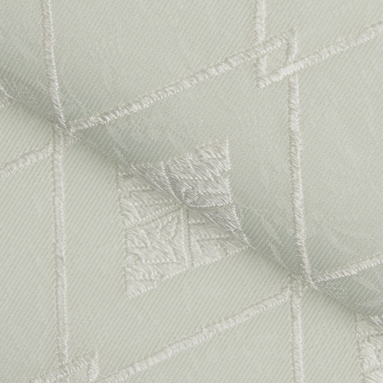 とても淡い緑味のある水色・薄雲鼠色の紗織の生地に笹蔓文様が織り出されたところに、生成り色の糸で菱繋ぎの文様が織られ、その中には花菱文様が唐織で織られた、格調高さのある素敵な夏の九寸名古屋帯です。