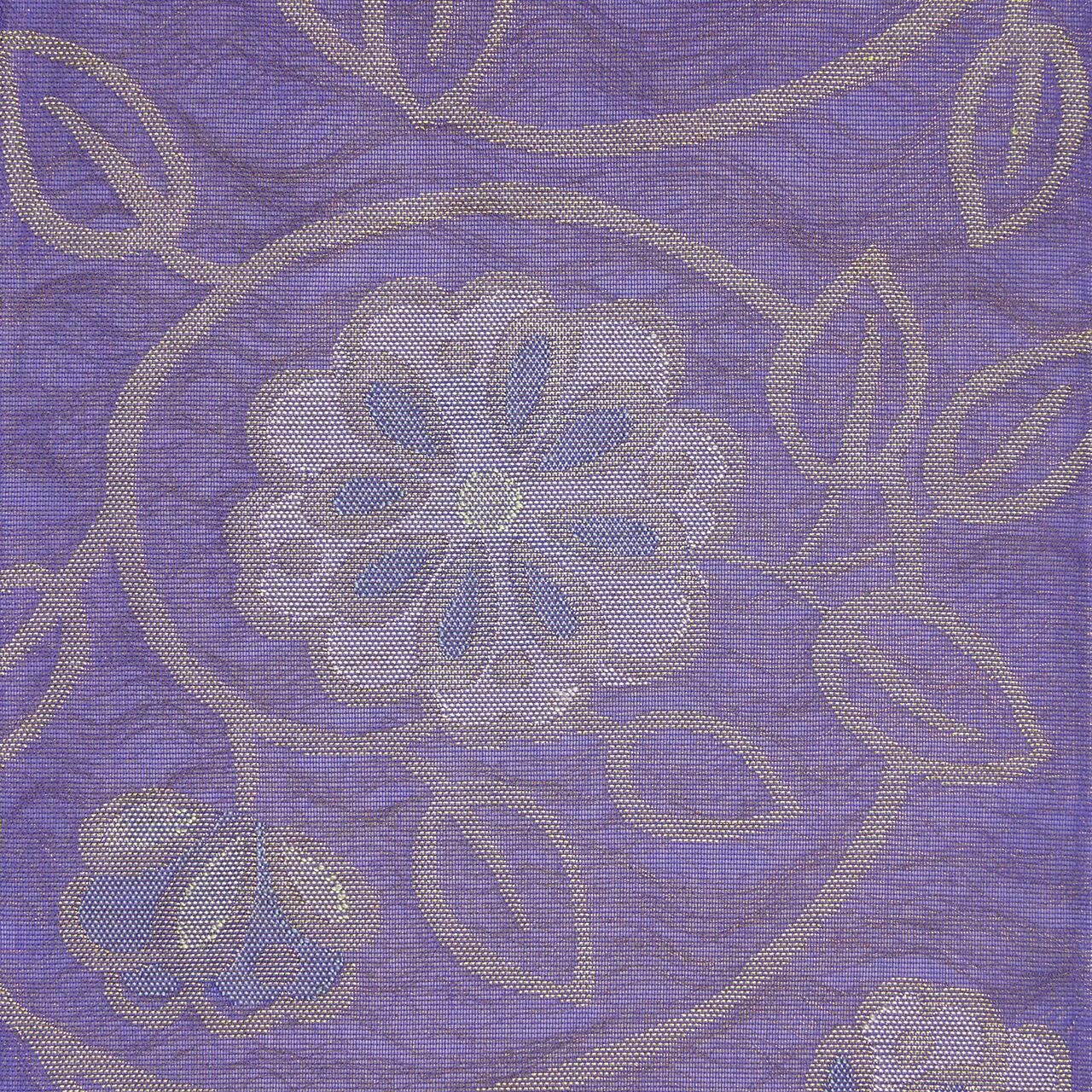 藍味のある薄紫・濃鼠色の紗の生地に、くるくるとした輪の形になった蔓と大きなお花、蕾、そして葉などが織り出された、涼しげな雰囲気の夏の袋帯です。