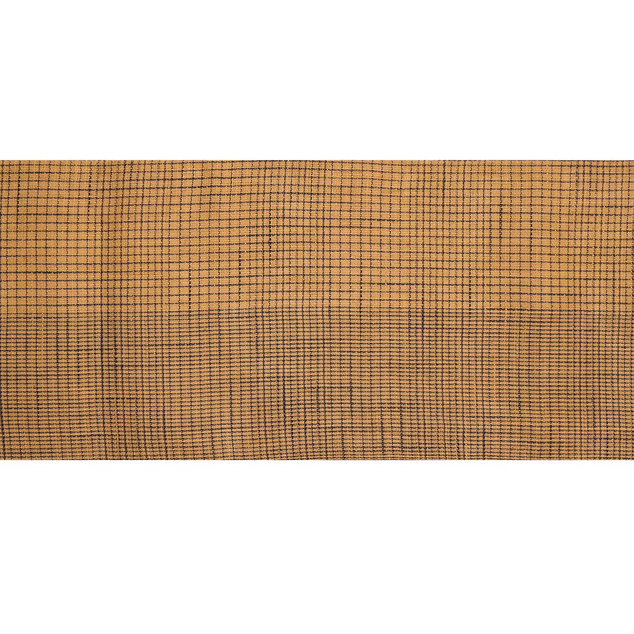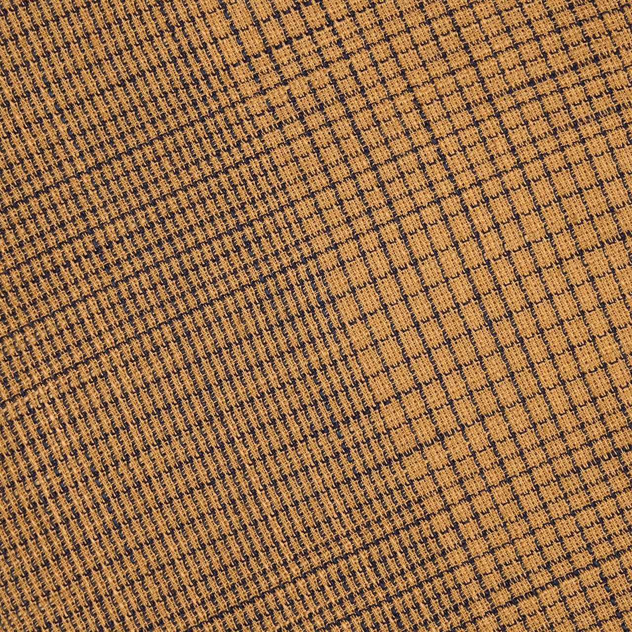 少し明るめの薄茶・芝翫茶色の麻の糸で織られた地に、檳榔子染色の縦縞が左側は細い幅で、右側はそれより少し太い幅で織られ、横にも縞模様が織られて、それが交差して変り格子の模様を構成したお洒落な雰囲気の夏の八寸名古屋帯です。