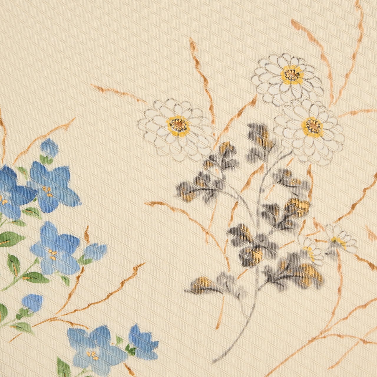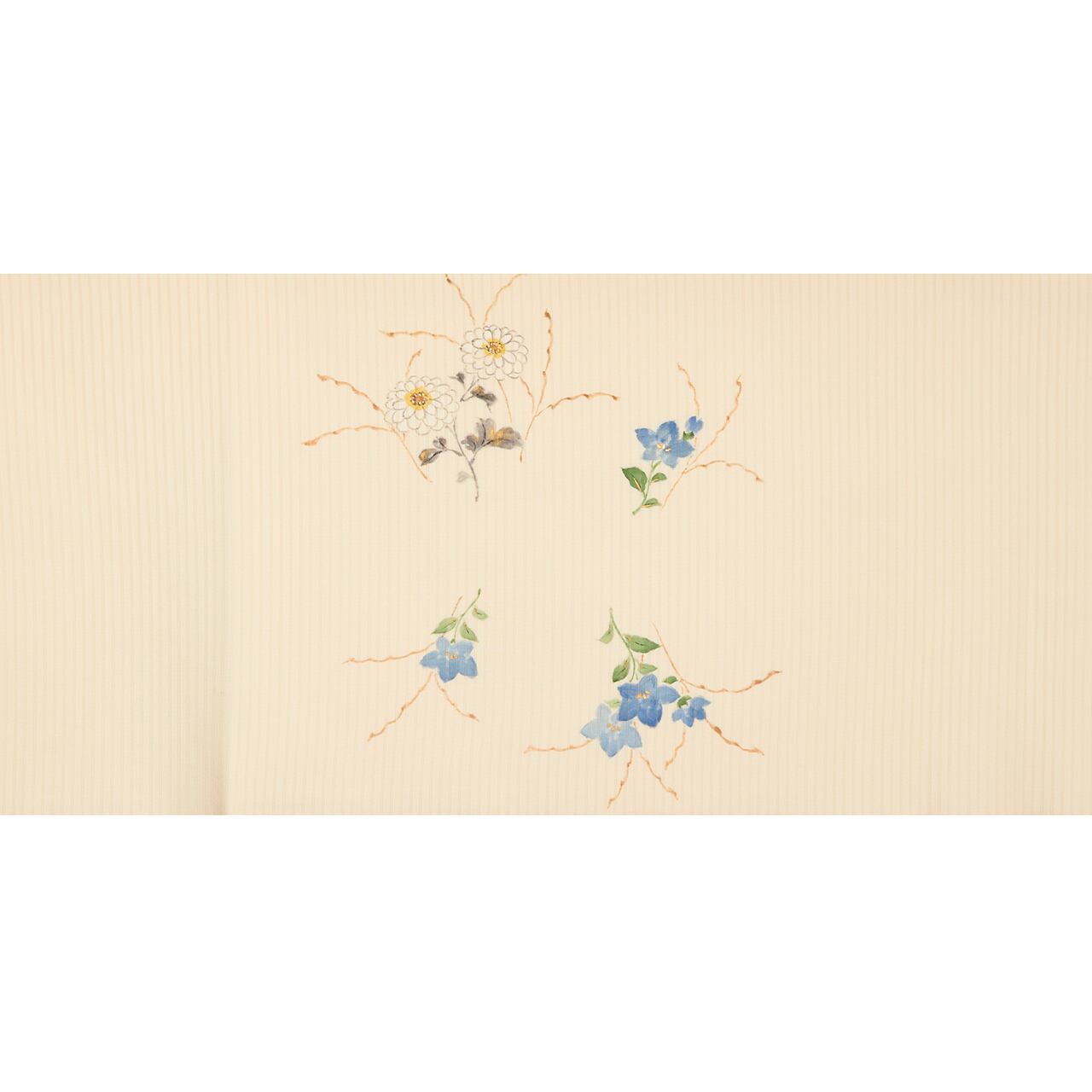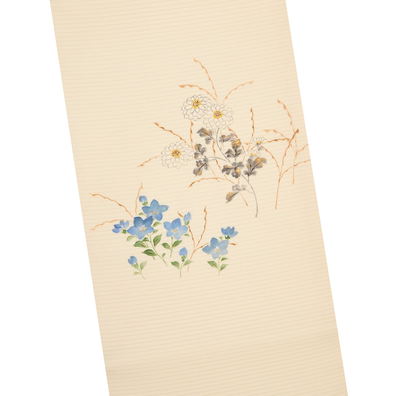 塩瀬よりは少ししなやかな手触りの絽目のある生地が、淡いクリーム色・鳥の子色に染められ、お太鼓にはススキの穂を背景に、綺麗な色の桔梗や白い菊のお花が手描きで美しく描かれた、素敵な夏の九寸名古屋帯です。