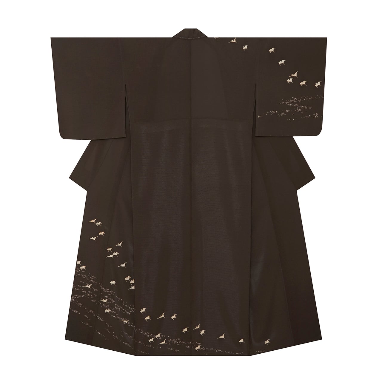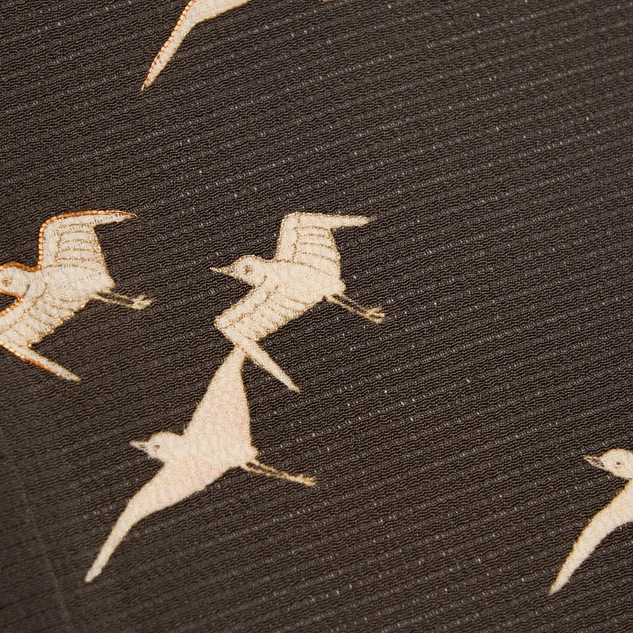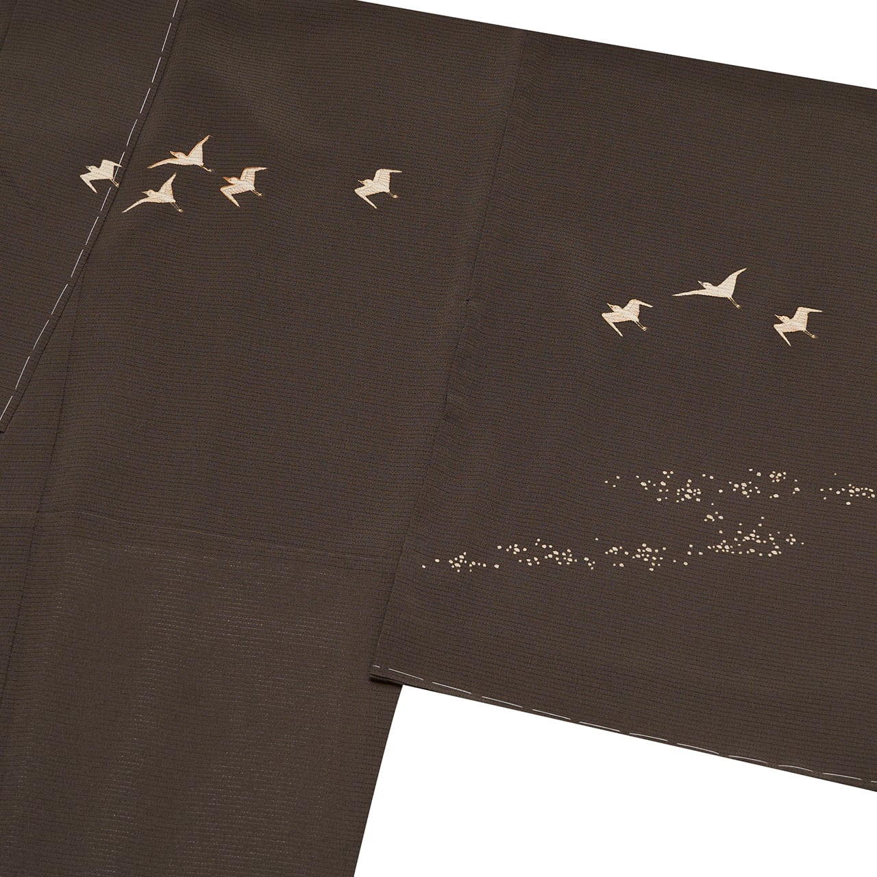 伊と幸さんの国産の良質な絽ちりめんの生地が少しグレー味のあるこげ茶・涅色に染められ、上前から下前にかけて潮が引いていくような浜辺の光る砂浜が点で描かれ、その上に群れを成して飛ぶ千鳥の姿がとても美しく描かれた、上品な風情のある素敵な夏のお着物です。