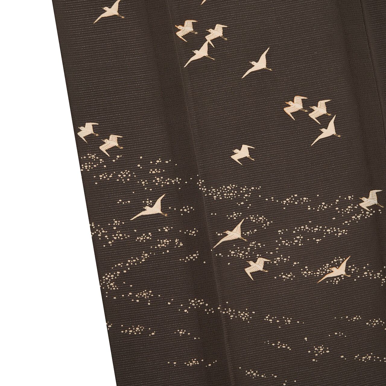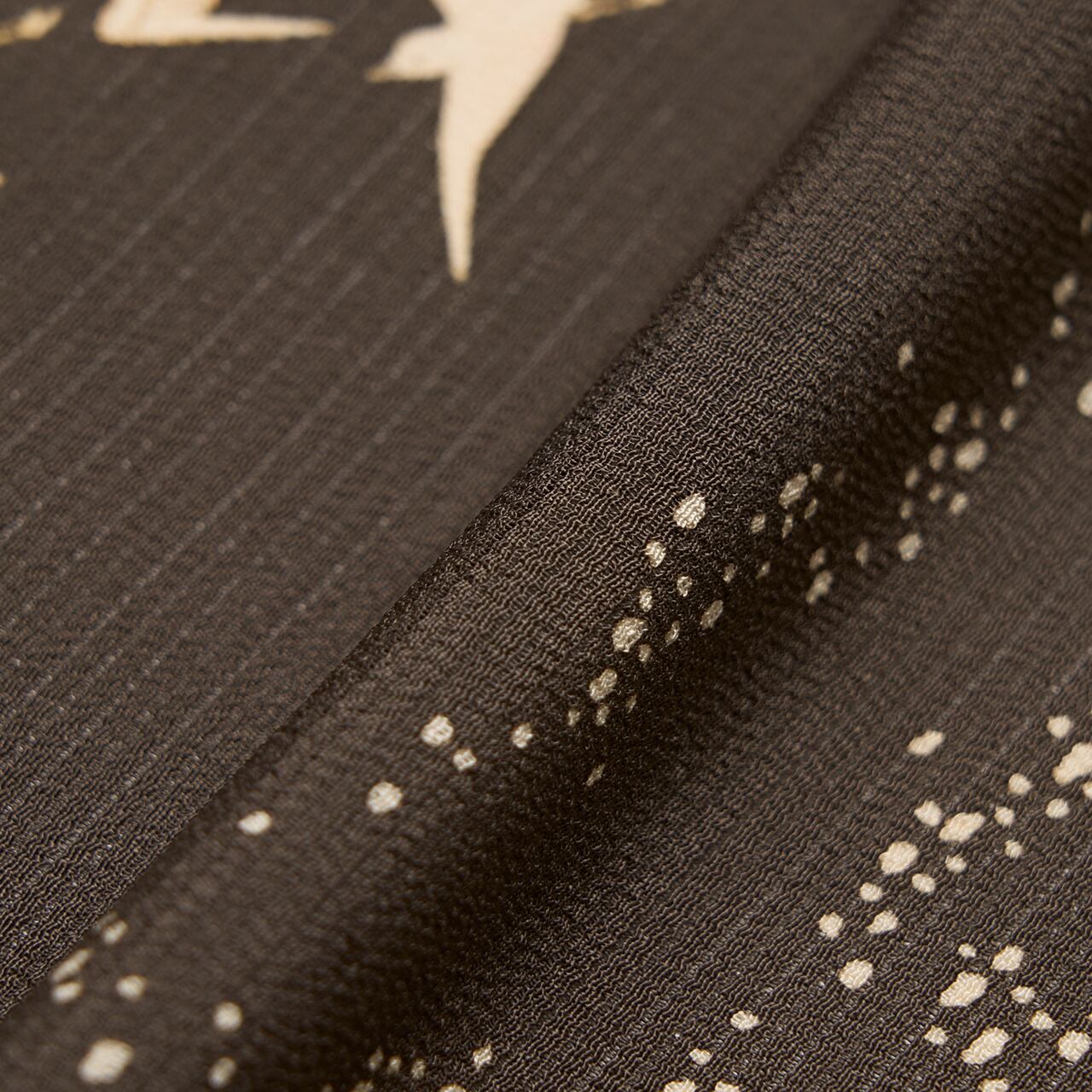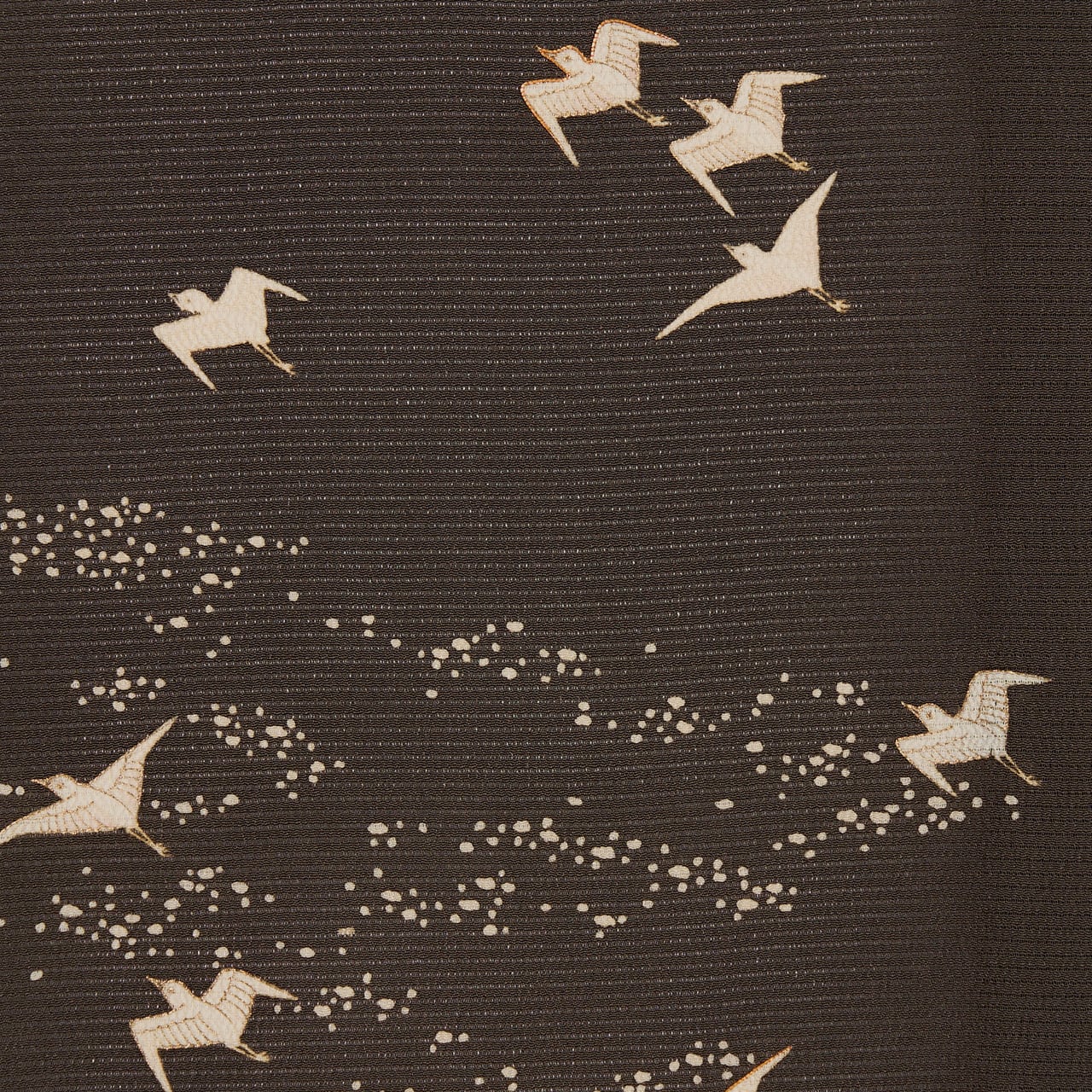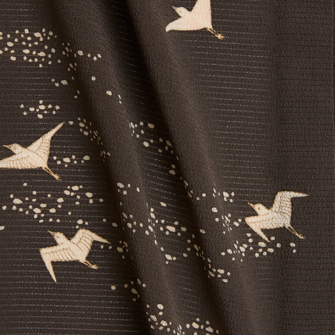 伊と幸さんの国産の良質な絽ちりめんの生地が少しグレー味のあるこげ茶・涅色に染められ、上前から下前にかけて潮が引いていくような浜辺の光る砂浜が点で描かれ、その上に群れを成して飛ぶ千鳥の姿がとても美しく描かれた、上品な風情のある素敵な夏のお着物です。