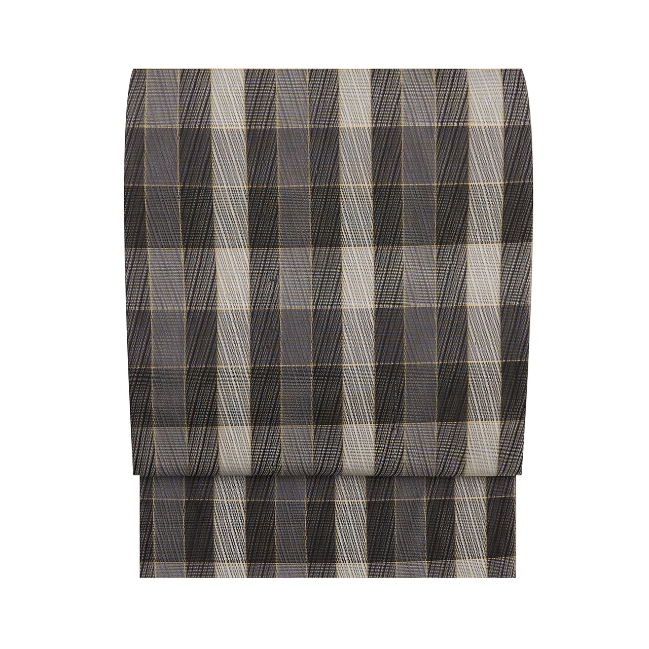 本羅織ならではの斜めの線がすっきりとしたモノトーンの色合いで、斜め縞と格子の模様を構成している、日本工芸会正会員である和泉明さん作のとてもお洒落な雰囲気の二部式の袋帯です。